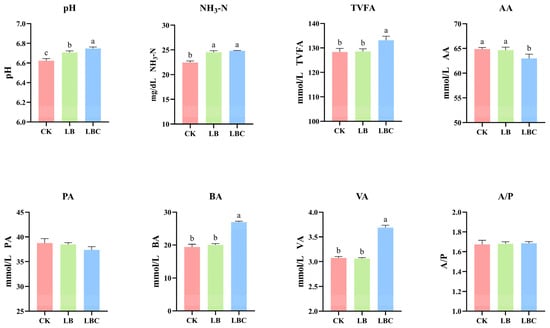 Effect of Lentilactobacillus buchneri and cellulase on the in vitro fermentation of sugar beet top–corncob silage. CK: No additives; LB: Lentilactobacillus buchneri; LBC: Combination treatment with Lentilactobacillus buchneri and cellulase. TVFA, Total volatile fatty acid; AA, Acetic acid; PA, Propionic acid; BA, Butyric acid; VA, Valeric acid; A/P, Acetic acid to propionic acid ratio. Different lowercase letters indicate significant differences (p < 0.05).