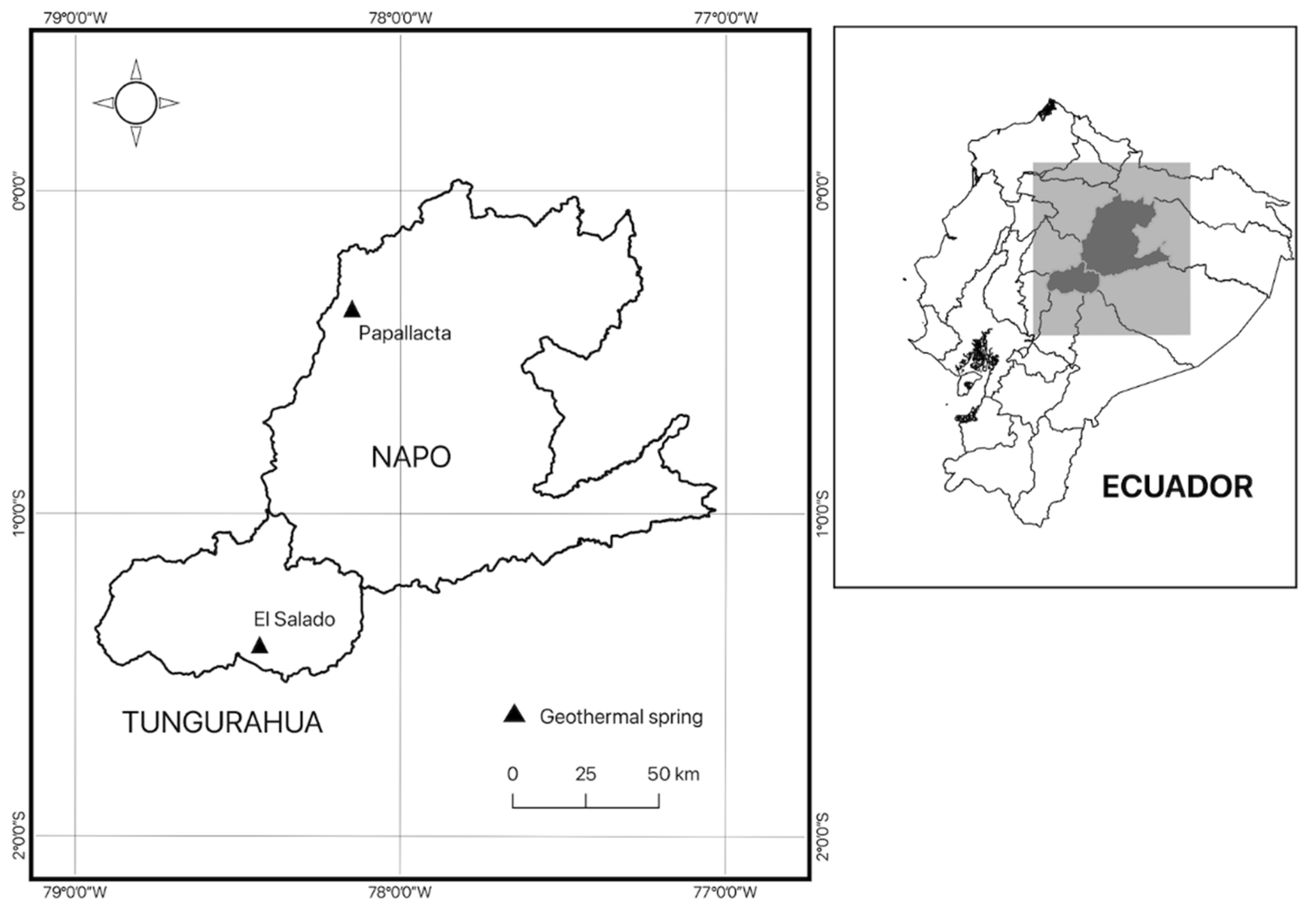 - Burbano, N.; Becerra, S.; Pasquel, E. Aguas Termo Minerales En El Ecuador. Inst. Nac. Meteorol. E Hidrol. (INAMHI) 2013. [Google Scholar]