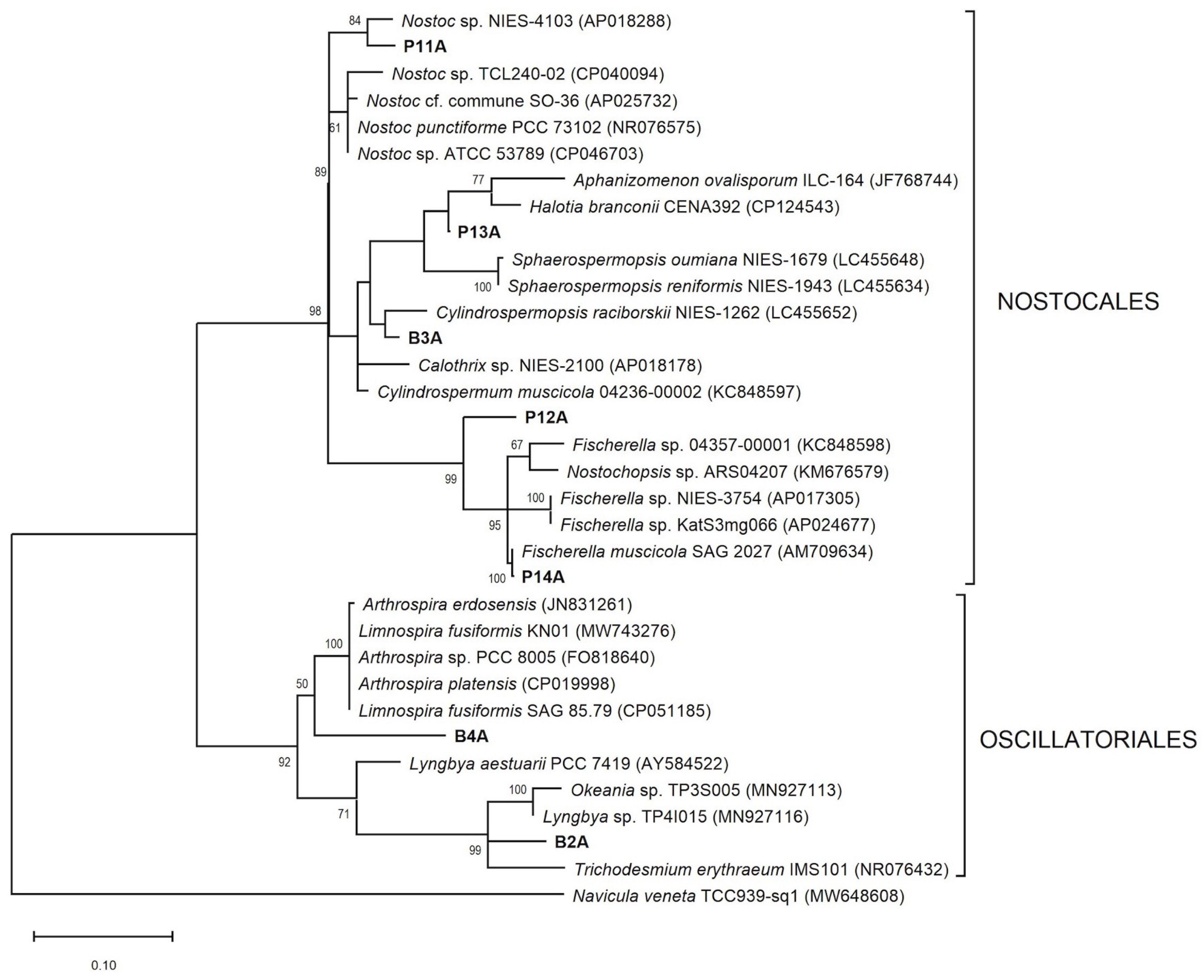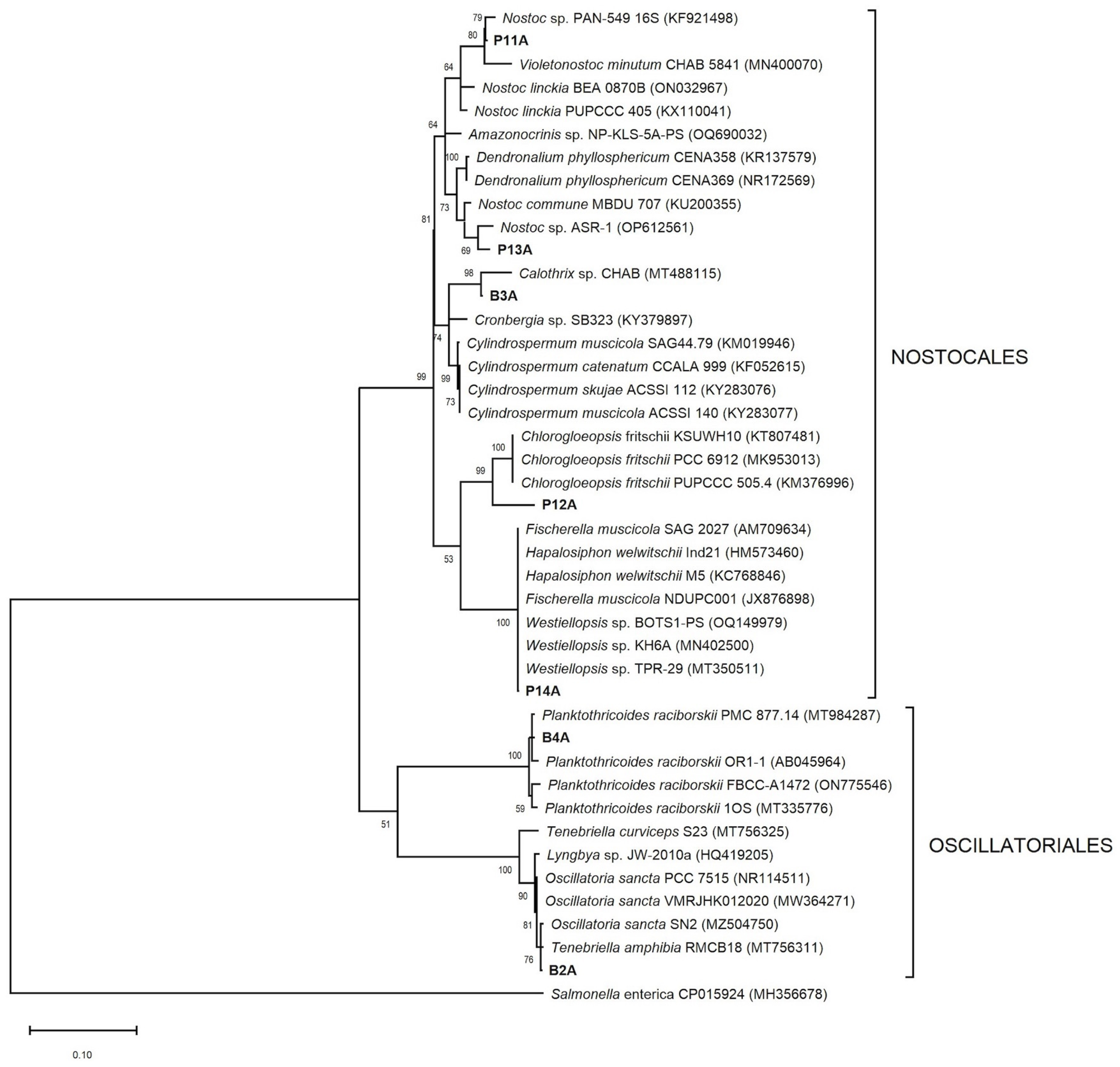 | P13A | Nostocales | MH090930 (633) | Dendronalium phyllosphericum CENA369 (NR172569) (98.2) | MH101460 (393) | Halotia branconii CENA392 (CP124543) (96.7) | Nostocacean cyanobacterium |