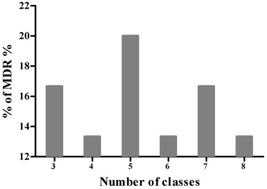 Based on the results of antimicrobial susceptibility testing, none of the isolates were classified as XDR or PDR. However, 71.11% of isolates were identified as MDR, exhibiting resistance to three or more classes of antibiotics. Among the latter isolates, 12.5% were resistant to 3 antibiotic classes, 18.8% to four classes, and 9.4% to five classes (Figure 2). Furthermore, 15.6%, 12.5%, and 18.8% of the isolates demonstrated resistance to six, seven, and eight antibiotic classes, respectively. Notably, 12.5% of the MDR isolates showed resistance to as many as 9 antibiotic classes.