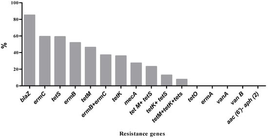 Among the isolates phenotypically identified as MRSA based on resistance to cefoxitin, only three isolates were found to harbor the mecA resistance gene. The blaZ gene, which confers resistance to penicillin, was the most frequently detected, present in approximately 86.7% of penicillin-resistant isolates (Figure 3). Tetracycline-resistant isolates were screened for four tet resistance genes. The tet(S) gene was the most prevalent, detected in 59% of the isolates, followed by tet(M) (46.2%) and tet(K) (35.9%). None of the isolates carried the tet(O) gene. Some isolates possessed multiple tet resistance genes, including combinations such as tet(M) + tet(S) (23.1%), tet(K) + tet(S) (12.8%), and tet(M) + tet(K) + tet(S) (7.7%). Regarding erythromycin resistance, three resistance genes were tested. The erm(C) gene was identified in 59.3% of resistant isolates, while erm(B) was present in 51.9%. The erm(A) gene was not detected in any of the isolates. Notably, 37% of the isolates carried both erm(B) and erm(C) genes. Genes associated with vancomycin resistance (vanA, vanB) and aminoglycoside resistance aac(6′)-Ie-aph(2″)-Ia were not detected in any of the assayed isolates.
