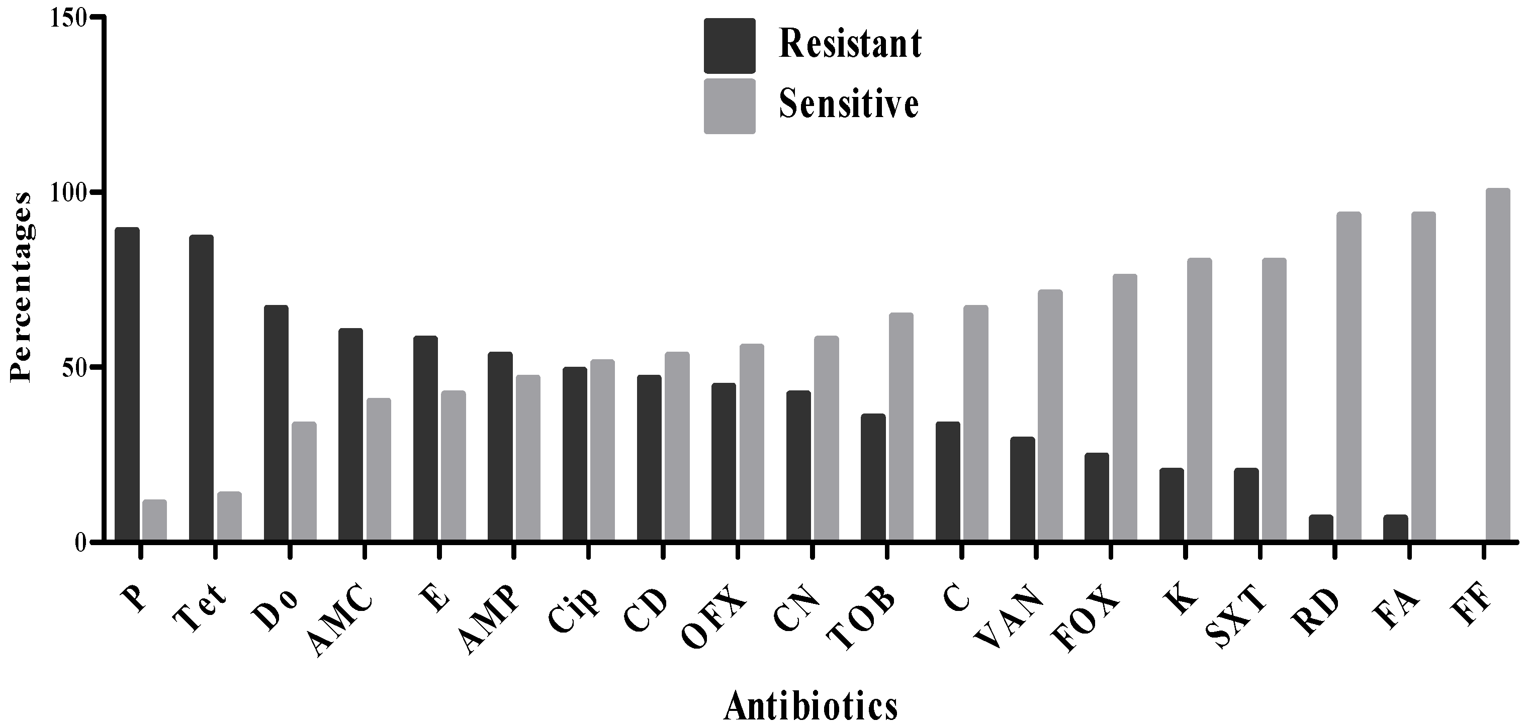 | AMC, P, VAN, GEN, E, CD, DO, TET; CIP, OFX, C | 11 | 7 | 0.57 |
