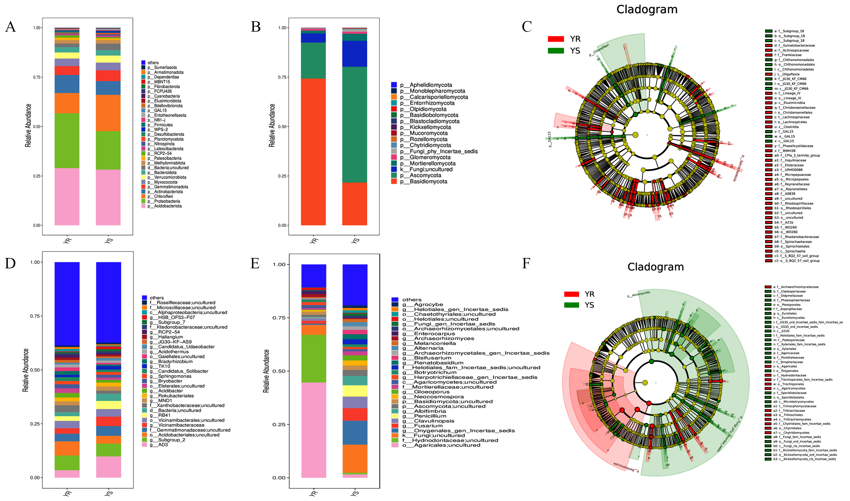 3.4. Analysis of Species Composition and Differences in Bacterial and Fungal Communities Between Diseased YS and Healthy YR Rhizosphere Soil