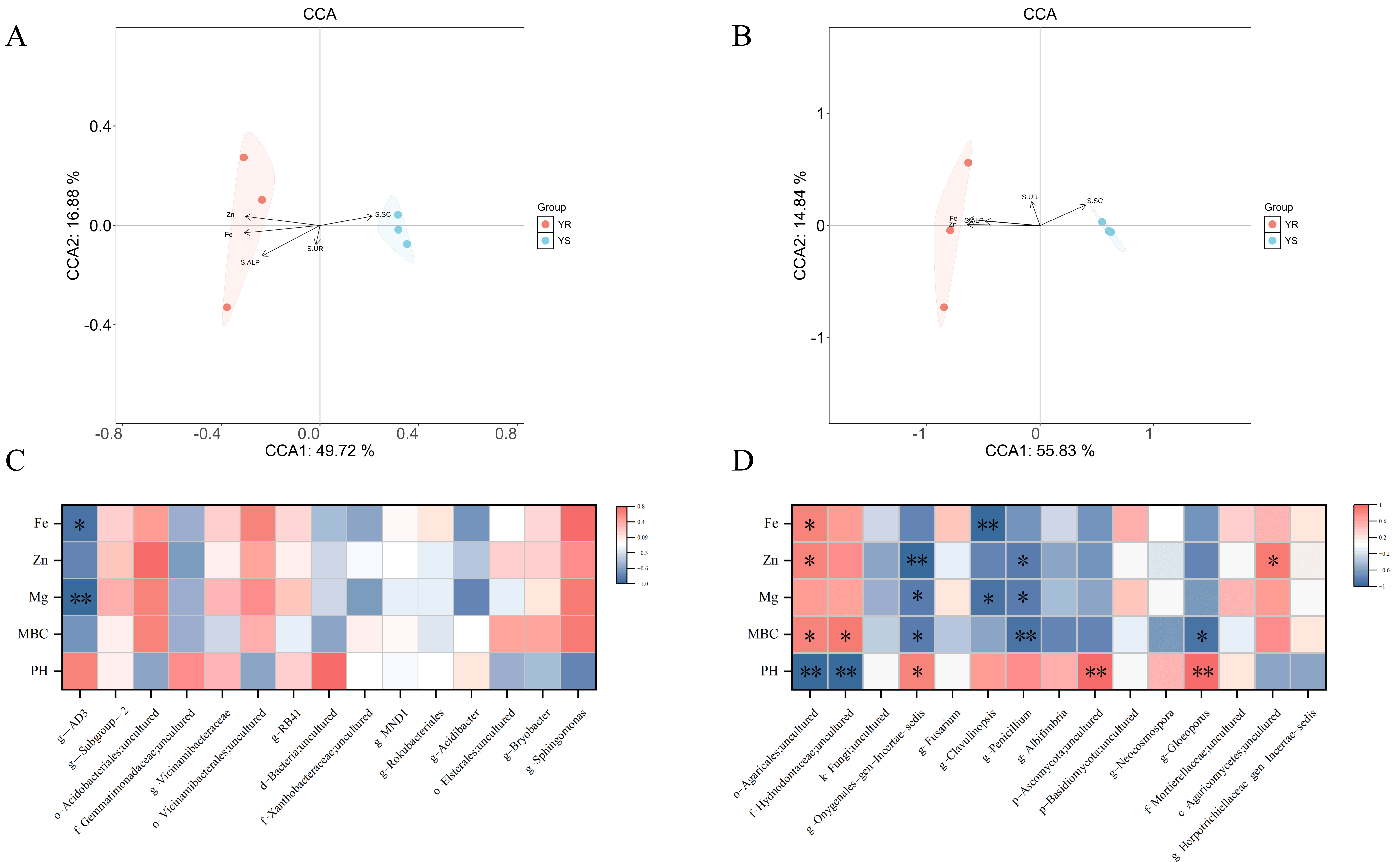 3.3. Analysis of Diversity and Structural Similarity in Bacterial and Fungal Communities of Diseased YS and Healthy YR Rhizosphere Soil