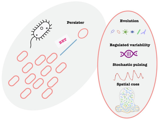 - Spratt, M.R.; Lane, K. Navigating Environmental Transitions: The Role of Phenotypic Variation in Bacterial Responses. mBio 2022, 13, e0221222. [Google Scholar] [CrossRef]