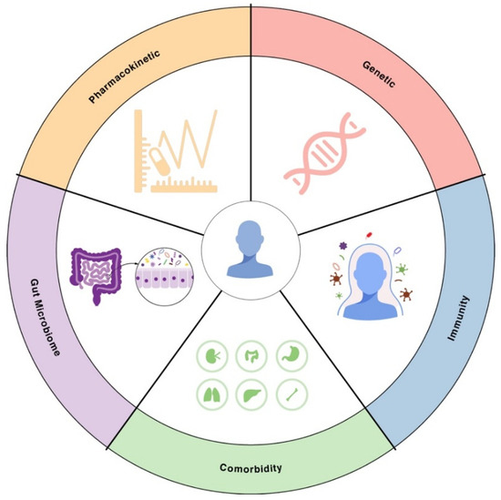 While bacterial factors are critical, the host context can make the difference between treatment success and failure, especially in infections caused by drug-resistant microbes. Patients vary widely in their immune capabilities, microbiomes, underlying diseases, and how their bodies process drugs (Figure 3). These factors can modulate both the likelihood of encountering an AMR pathogen and the outcome of an AMR infection. In following sections, we explore key host variability factors, including immunity, comorbidity, gut microbiome, pharmacokinetic factors.