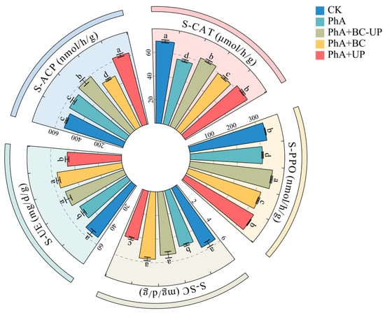 This broad inhibition was effectively alleviated by the BC-UP composite particles, which significantly increased the activities of all five enzymes by 6.5% to 14.9% relative to the PhA treatment. Similarly, biochar (BC) alone also enhanced most enzyme activities, with sucrase and urease showing the most pronounced increases (16.6% and 16.7%), followed by catalase (6.0%) and polyphenol oxidase (5.5%). However, the rise in soil pH from biochar significantly reduced acid phosphatase activity. The PhA+UP treatment increased catalase, polyphenol oxidase, and acid phosphatase by 9.3% to 12.9% but was less effective for other enzymes. Cross-comparison confirmed BC-UP’s superior overall efficacy, as BC exhibited significantly lower activities in catalase, polyphenol oxidase, and acid phosphatase, while UP showed higher acid phosphatase but lower activities in the other four enzymes. In summary, BC-UP provided the most balanced and comprehensive alleviation of phenolic acid-induced suppression of soil enzyme activity.