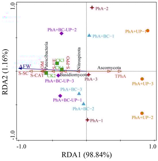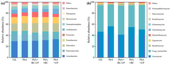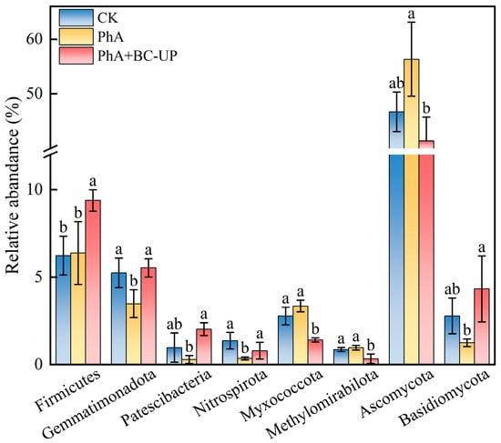 ANOVA revealed significant differences (p < 0.05) in the relative abundance of six bacterial and two fungal species among the CK, PhA, and PhA+BC-UP treatments (Figure 6). Compared to the PhA, PhA+BC-UP significantly increased the relative abundance of Firmicutes, Gemmatimonadota, Patescibacteria, and Nitrospirota by 0.47-, 0.58-, 6.12-, and 1.29-fold, respectively. Conversely, the abundances of Myxococcota and Methylomirabilota were significantly reduced by 58.01% and 66.43%. For fungi, the PhA treatment increased Ascomycota and decreased Basidiomycota relative to CK. Notably, the PhA+BC-UP treatment reversed this trend, reducing Ascomycota by 26.55% and increasing Basidiomycota by 2.47-fold compared to PhA (p < 0.05).