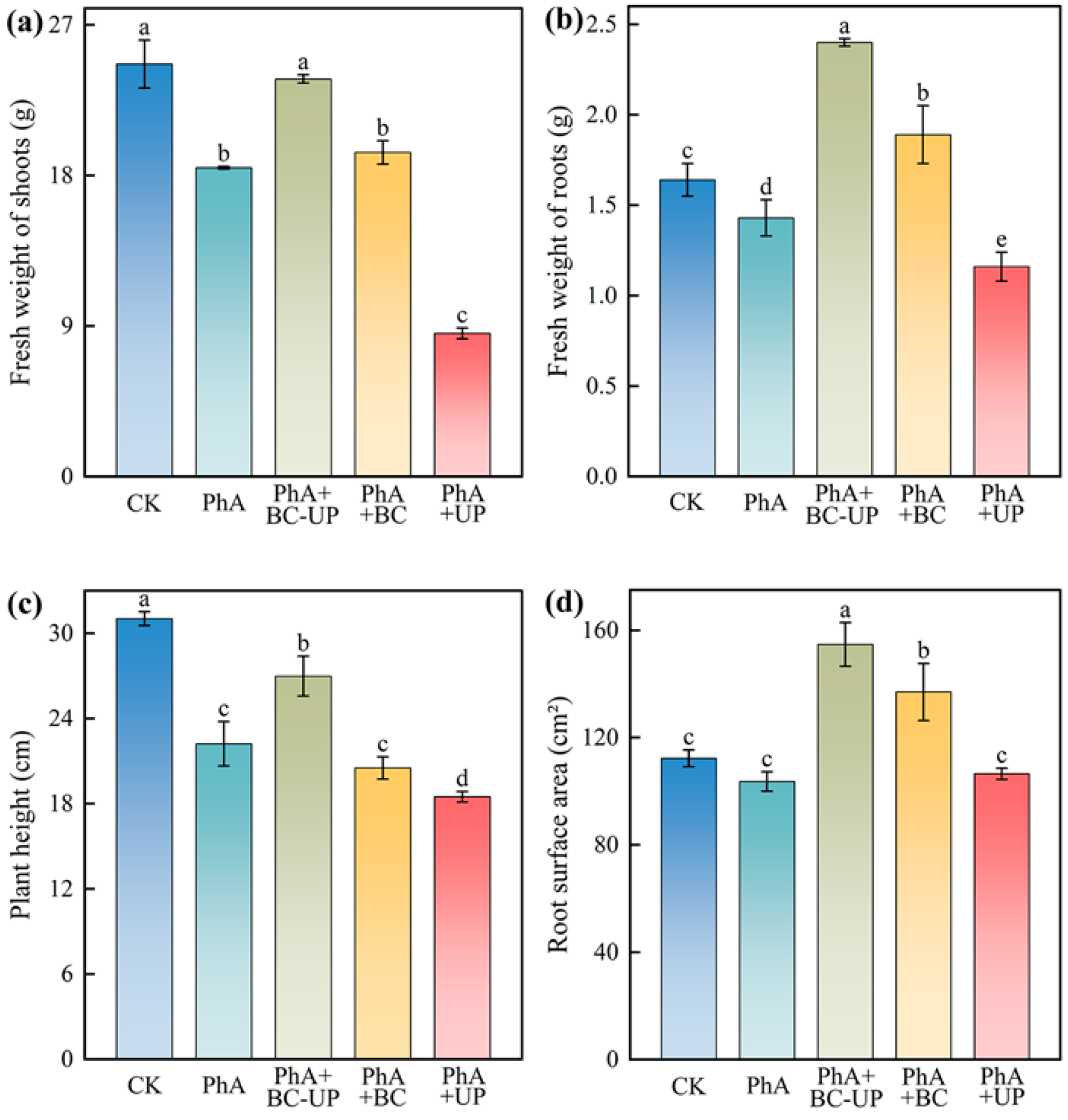 Furthermore, the PhA+BC-UP treatment outperformed the individual PhA+BC and PhA+UP treatments, increasing shoot fresh weight by 22.7% and 177.7%, root fresh weight by 27.0% and 106.9%, plant height by 31.5% and 46.0%, and root surface area by 12.9% and 45.3% (p < 0.05), respectively. This demonstrates the superior efficacy of the combined BC-UP conditioner in alleviating phenolic acid-induced growth inhibition.