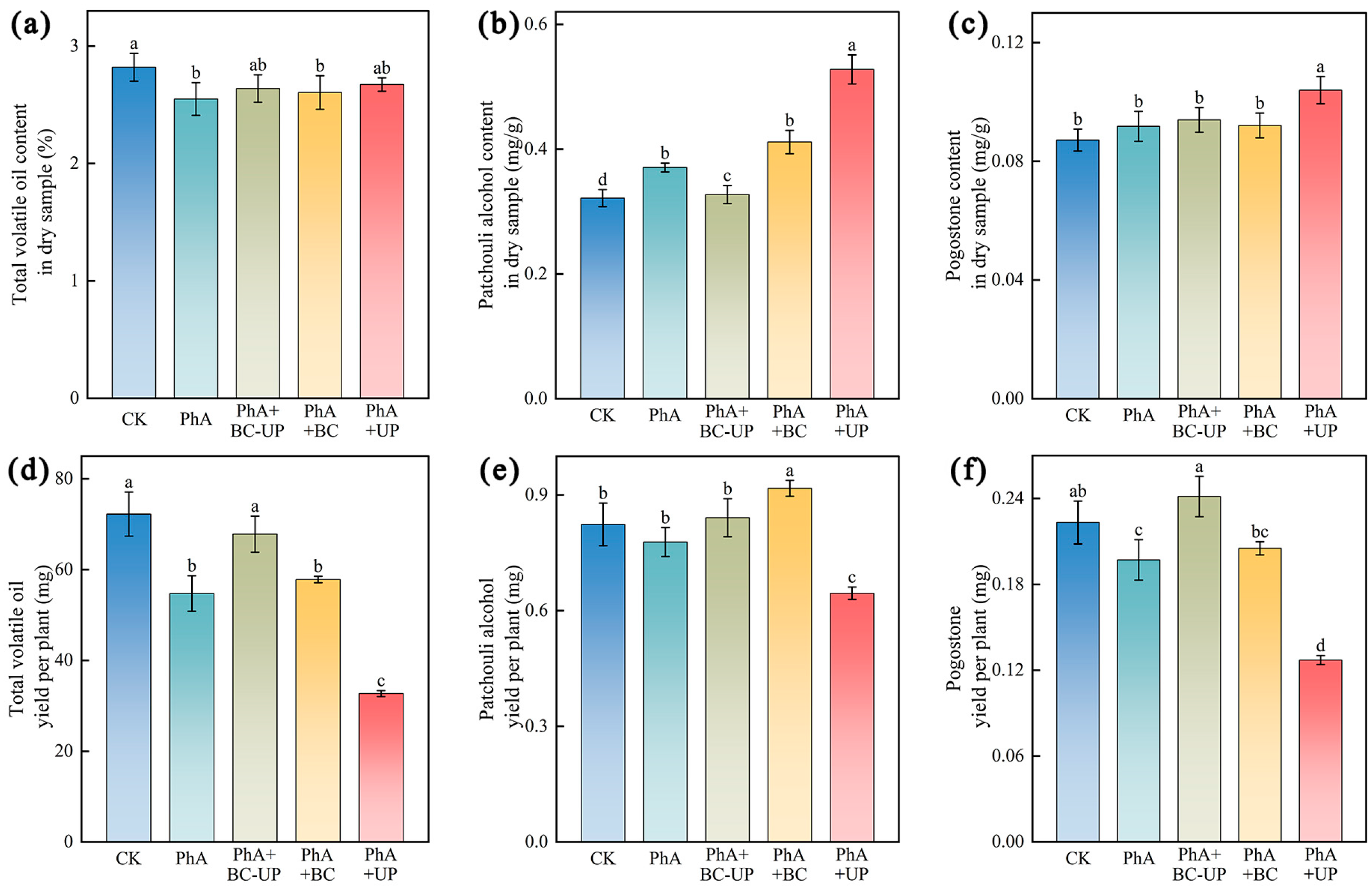 In fresh shoots per plant (Figure 2d–f), PhA significantly reduced biomass and the yield of all components, decreasing total volatile oil, patchouli alcohol, and pogostone by 24.2%, 5.5%, and 11.7%, respectively (p < 0.05 for oil and pogostone). BC-containing particles counteracted this reduction: PhA+BC-UP increased these components by 23.9%, 8.1%, and 22.5%, while PhA+BC increased them by 5.6%, 17.9%, and 4.1%, respectively, compared to PhA. In contrast, PhA+UP severely inhibited biomass, resulting in the lowest per-plant yield of active components. Thus, BC-UP particles achieved a superior balance in enhancing the comprehensive yield of active compounds.