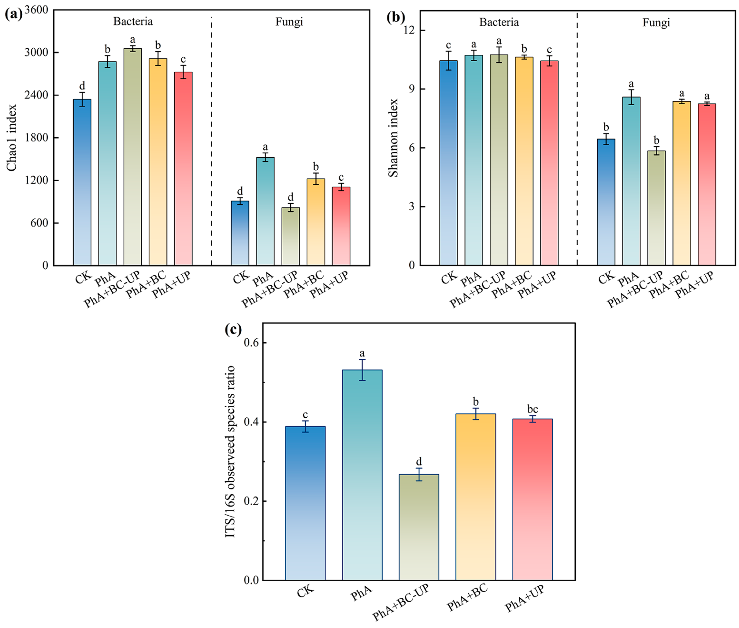 Compared to the control (CK), the PhA treatment profoundly enhanced fungal diversity, increasing the Chao1 and Shannon indices by 67.8% and 33.2% (p < 0.05) versus CK. This effect was reversed by BC-UP particles, which significantly reduced these indices by 46.4% and 31.9%, respectively, compared to PhA. PhA+BC and PhA+UP also slightly lowered fungal diversity.