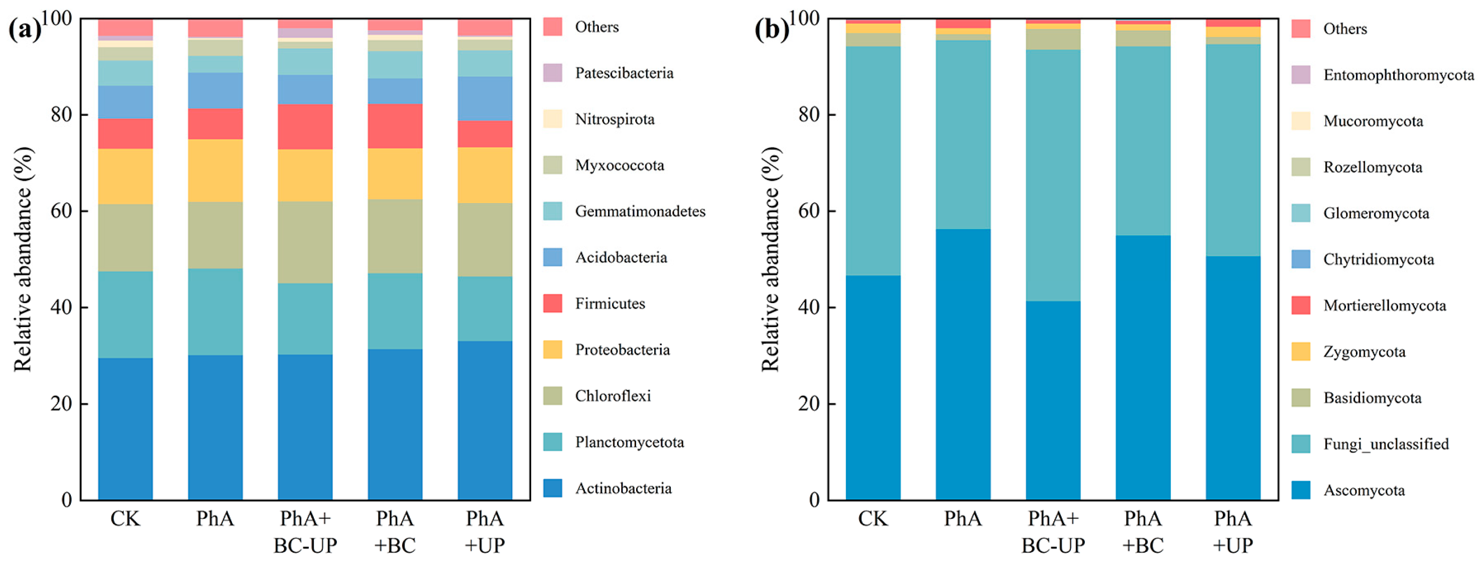 Principal Component Analysis (PCA) revealed distinct shifts in the rhizosphere soil microbial community structure under different treatments. For bacterial communities (Figure S3a), the first two principal components (PCA1 and PCA2) explained 54.03% and 13.30% of the variation, respectively (cumulative 67.33%). The PhA treatment samples were clearly separated from the clustered CK control, indicating community restructuring. Samples from PhA+BC-UP, PhA+BC, and PhA+UP treatments showed varying degrees of separation from PhA, confirming their mitigating effects.