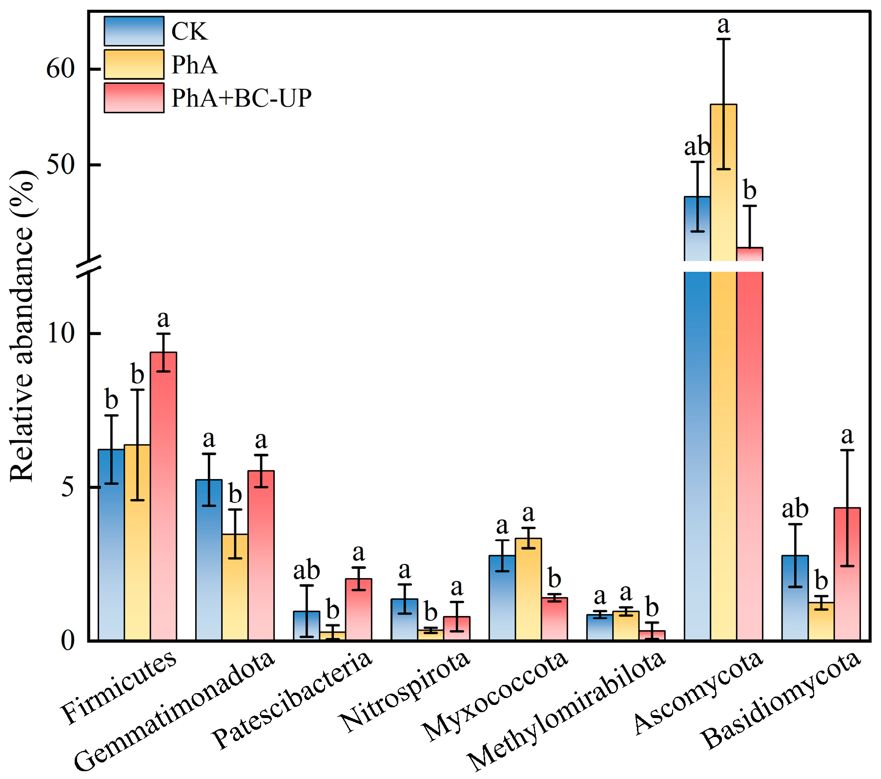 Figure 6. Relative abundance of signature biomarkers in rhizosphere soil under CK, PhA, PhA+BC-UP treatment. Data are presented as the mean ± SD (n = 3). Different lowercase letters above the bars indicate statistically significant differences among treatments as determined by one-way ANOVA followed by Duncan’s new multiple range test (p < 0.05).