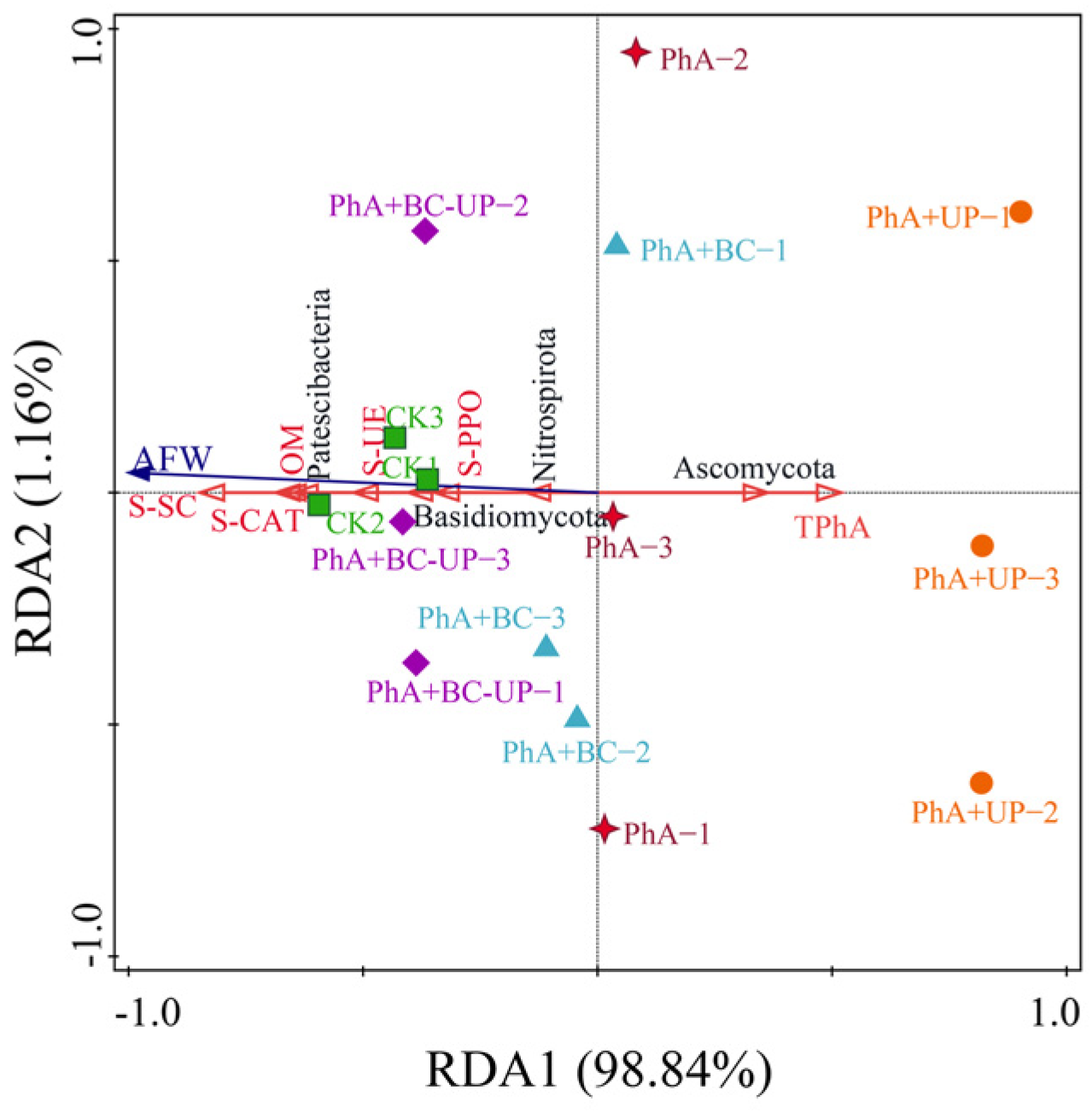 A similar pattern was observed for fungal communities (Figure S3b), with PCA1 and PCA2 explaining 61.58% and 14.18% of the variance, respectively. The CK group was distinctly separated, confirming PhA-induced restructuring. The PhA+BC-UP replicates formed a distinct cluster away from PhA, while PhA+BC and PhA+UP remained closer, suggesting BC-UP was more effective in altering the fungal community.