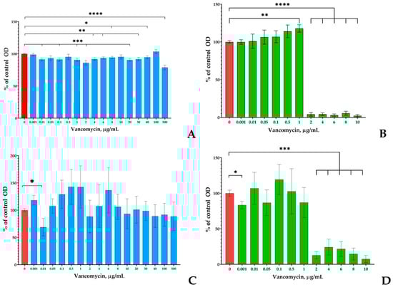 For S. aureus 209P, both planktonic cultures and biofilms were strongly inhibited by vancomycin at concentrations of 2 µg/mL and above. At lower concentrations, planktonic cultures were stimulated, reaching a maximum of 18% at 1 µg/mL, whereas biofilms showed no linear dependence similarly to planktonic cultures. Notably, at 0.001 µg/mL, there was a significant 17% decrease in OD of CV extracts. This concentration is much lower than that used in clinical practice [51]; due to this interesting phenomenon, we decided to use this ultralow concentration of vancomycin. Additionally, because S. aureus is an opportunistic pathogen of higher clinical concern, we chose a vancomycin concentration effective against it. Therefore, we selected 0.001 µg/mL for subsequent experiments.