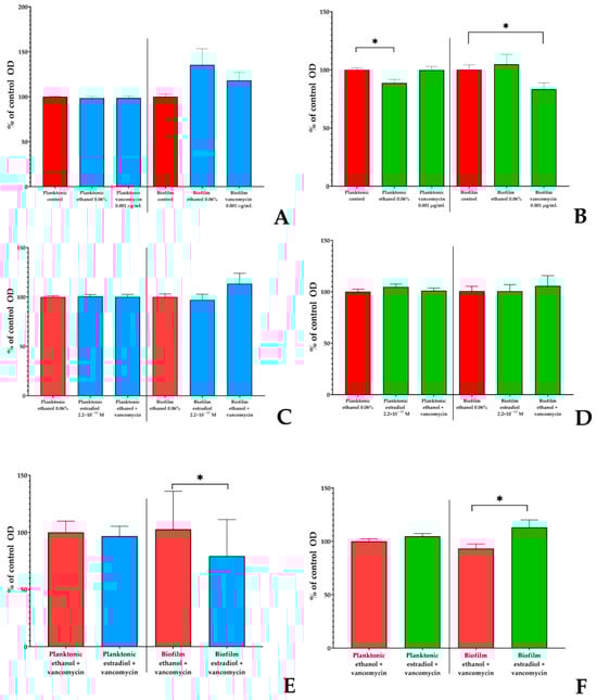 The effects of active compounds in monospecies biofilms of L. paracasei AK508 (A,C,E) and S. aureus 209P (B,D,F) grown on PTFE cubes and stained with CV. (A,B)—the effects of ethanol and vancomycin in comparison with controls without additions; (C,D)—the effects of estradiol and the combination of vancomycin and ethanol in comparison with ethanol-treated samples; (E,F)—the effect of the combination of vancomycin and estradiol in comparison with samples treated with the combination of ethanol and vancomycin * p < 0.05.