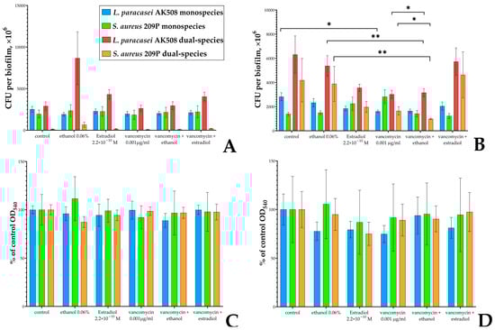 Effects of estradiol and vancomycin on CFU counts (A,B) and OD540 of formazan extracts (C,D) for S. aureus 209P and L. paracasei AK508. * p < 0.05; ** p < 0.01.
