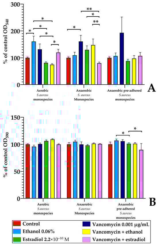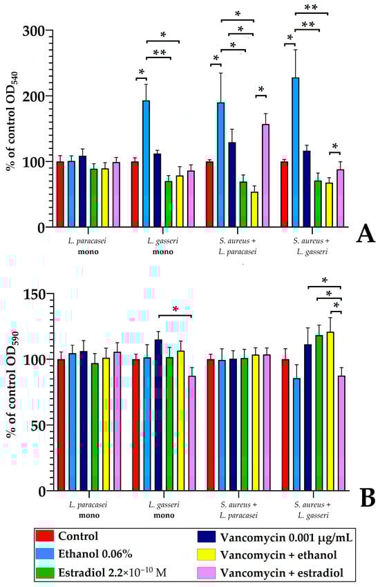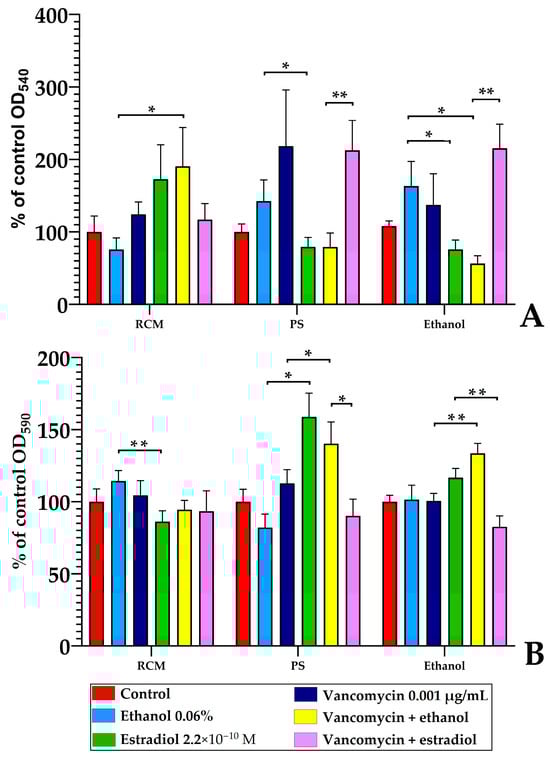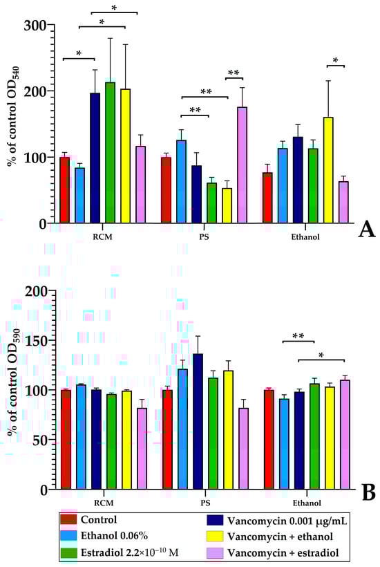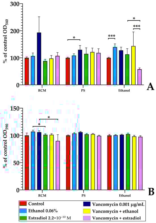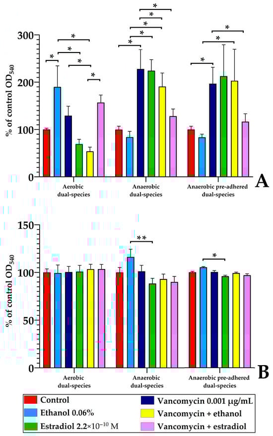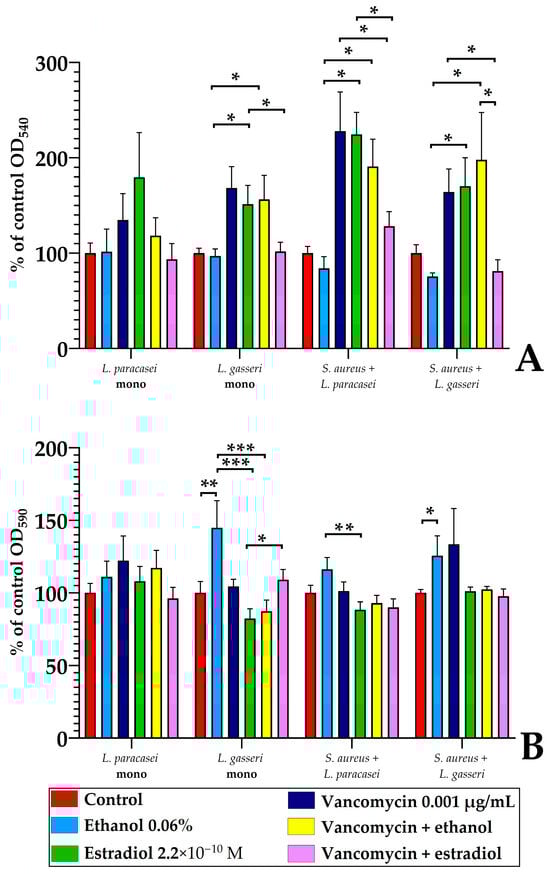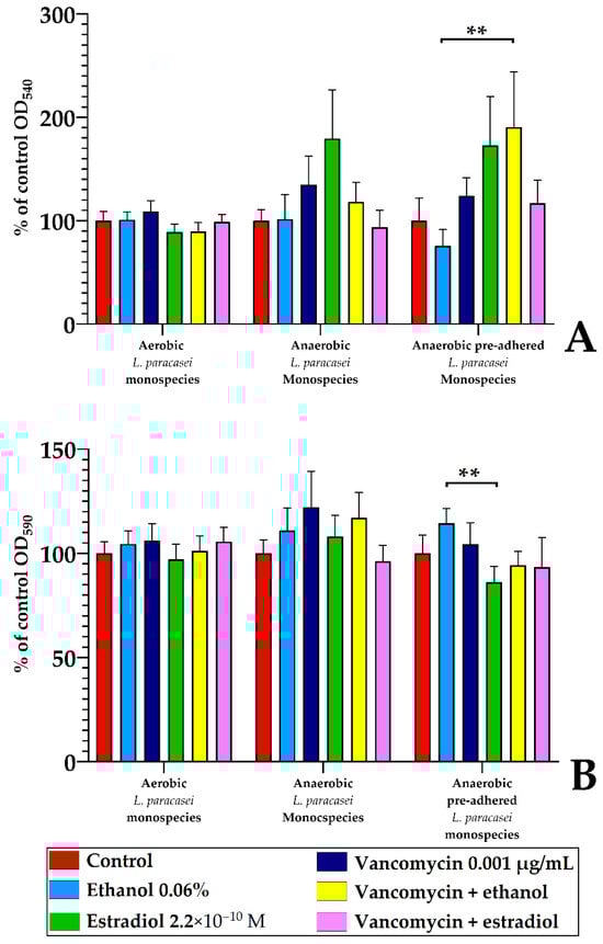 We tested the combination of 0.001 µg/mL vancomycin and 2.2 × 10−10 M estradiol under anaerobic conditions. Estradiol enhanced the inhibition of L. paracasei biofilms by vancomycin (Figure 2E): biofilm biomass decreased by 21% relative to the ‘vancomycin plus ethanol’ control. Planktonic growth of lactobacilli was unaffected by any compound or combination.