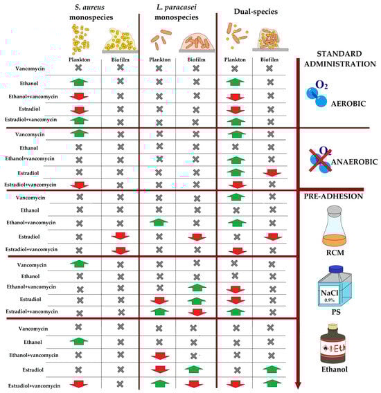 In summary, estradiol and ethanol often blocked the the effectiveness vancomycin in both monospecies and dual-species biofilms of L. paracasei and S. aureus. This was evident at the biomass and transcriptional levels. Estradiol’s effects on lactobacilli were dependent on the species and conditions, but the antagonism between vancomycin and estradiol was consistent across the three species examined. The stimulation of S. aureus biomass in dual-species biofilms by the combination of vancomycin and ethanol may be mediated, at least in part, by the upregulation of vanTG gene, an effect that is partially neutralized by estradiol. Estradiol was more effective when adsorbed to the biofilm carrier surface, acting as a regulator of lipid synthesis in lactobacilli. These findings underscore estradiol’s capacity to influence multispecies biofilms and support further investigation into its molecular targets and potential applications in microbiology and medicine.
