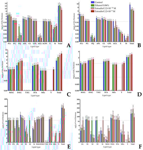 Because of the ability of estradiol to affect cell membranes [19], we analyzed the lipid composition of cells and biofilm matrix of L. paracasei. For that, biofilms were obtained on the surface of cellulose filters. Two strains were studied: the kvass-derived AK508 and the gut-derived 27 W. Biofilms were grown as described previously [37] with modifications. Briefly, lactobacilli were grown on 1.5% MRS agar (for higher biomass yield) in the presence of ethanol, 2.2 × 10−10 M estradiol, 2.2 × 10−8 M estradiol, or without additions. The higher estradiol concentration was included based on prior observations [33]. A sterile cellulose filter (Ozon, Russia) was placed on the agar surface, and 500 µL of culture adjusted to OD540 = 0.5 was spread onto the filter. Biofilms were incubated anaerobically for 72 h at 33 °C.