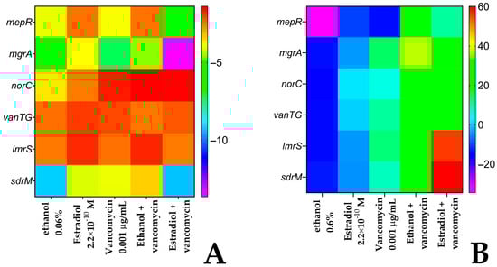 To investigate changes in expression of antibiotic resistance genes, quantitative polymerase chain reaction (qPCR) was performed. Previous studies have shown that hormones, antibiotics, and their combinations can alter the expression of a wide range of resistance genes [12,47]. Thus, we analyzed not only glycopeptide resistance genes but also genes conferring resistance to other antibiotic classes. We used the The Comprehensive Antibiotic Resistance Database [48] to identify resistance genes in S. aureus 209P, a more dangerous bacterium. The genes found in the strain are described in Supplementary Data S3.