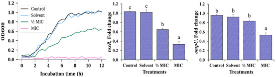 toxR remained close to unity in both the negative control and the solvent control, confirming that the vehicle alone does not interfere with the basal activity of this master regulator. However, at ½ MIC,