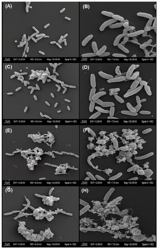 Figure 2). In the negative control (panels A and B), bacteria retained the characteristic bacillary morphology, with well-defined contours, smooth and continuous surfaces, and no signs of envelope collapse. Cells appeared predominantly dispersed, with minimal aggregation and an absence of amorphous extracellular material; this condition was therefore considered the basal morphological reference. Similarly, in the solvent control (panels C and D), cells preserved an appearance comparable to the negative control, displaying intact rod-shaped forms, homogeneous surface topography and apparently continuous membranes. Only occasional microaggregates and a slight increase in the proximity between cells were observed, without noticeable deformation or accumulation of debris, indicating that ethanol at 1% (