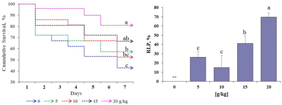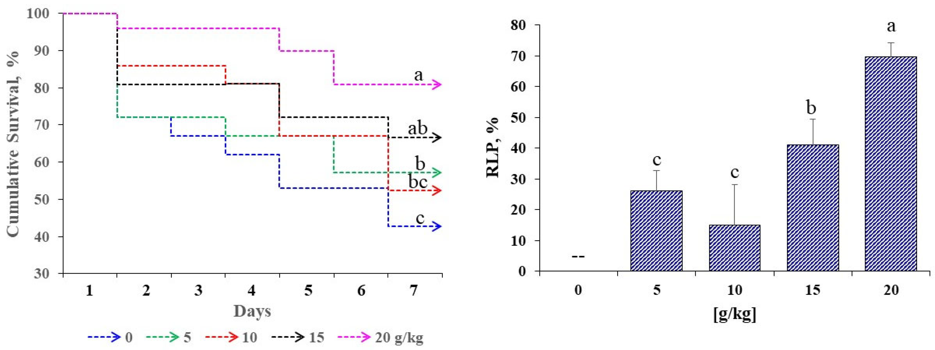 p < 0.05). Final survival increased with dose, peaking at 20 g/kg, whereas the control recorded the lowest values. RLP followed the same pattern, with a maximum at 20 g/kg, while 5 g/kg and 10 g/kg did not differ significantly from each other. The higher doses yielded the best performance in both growth and survival.