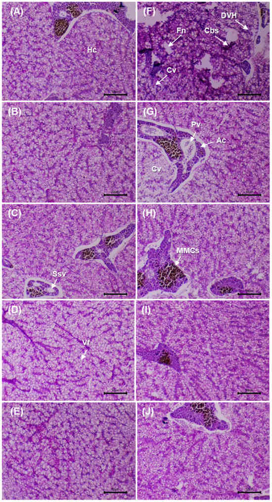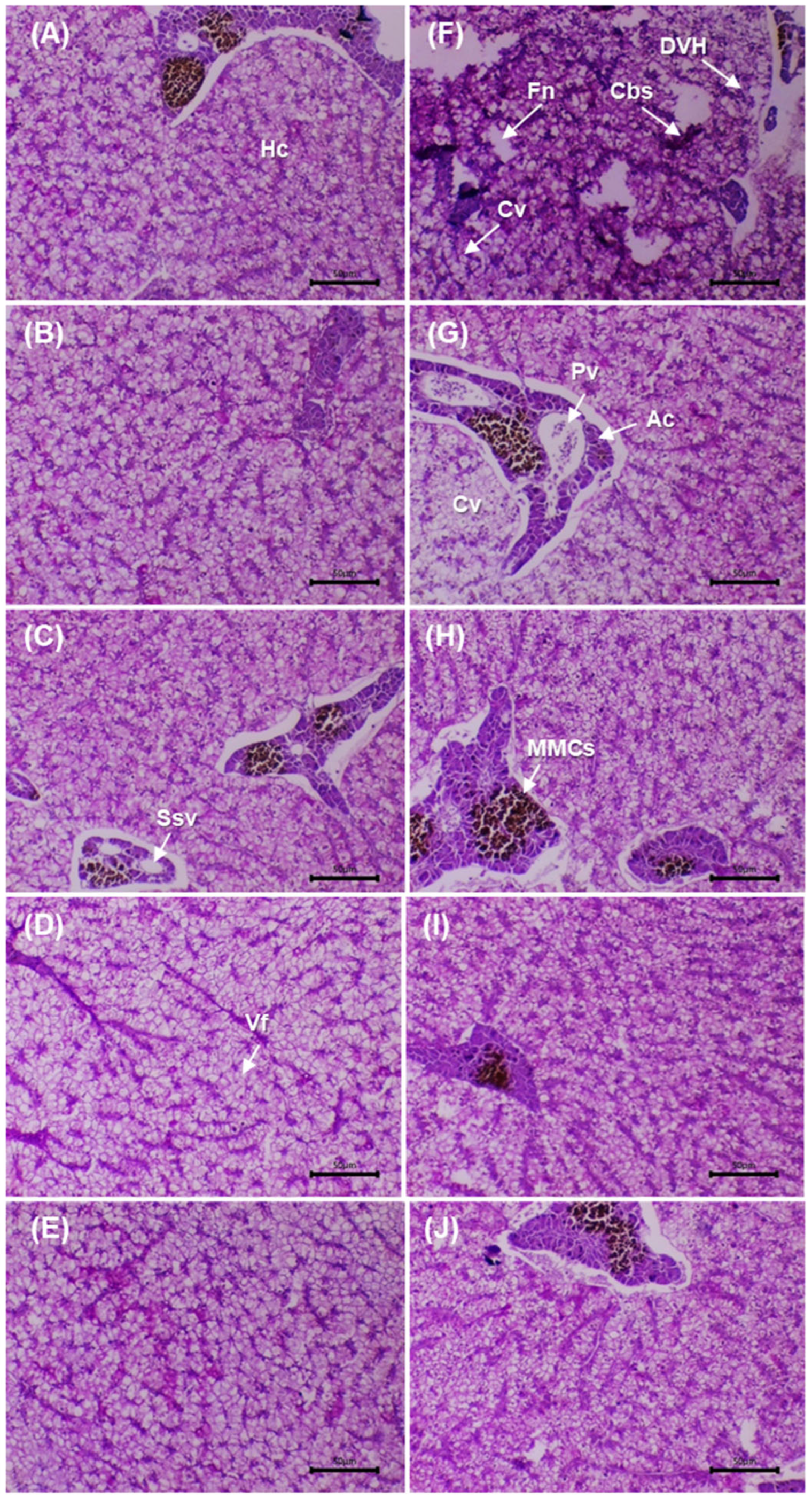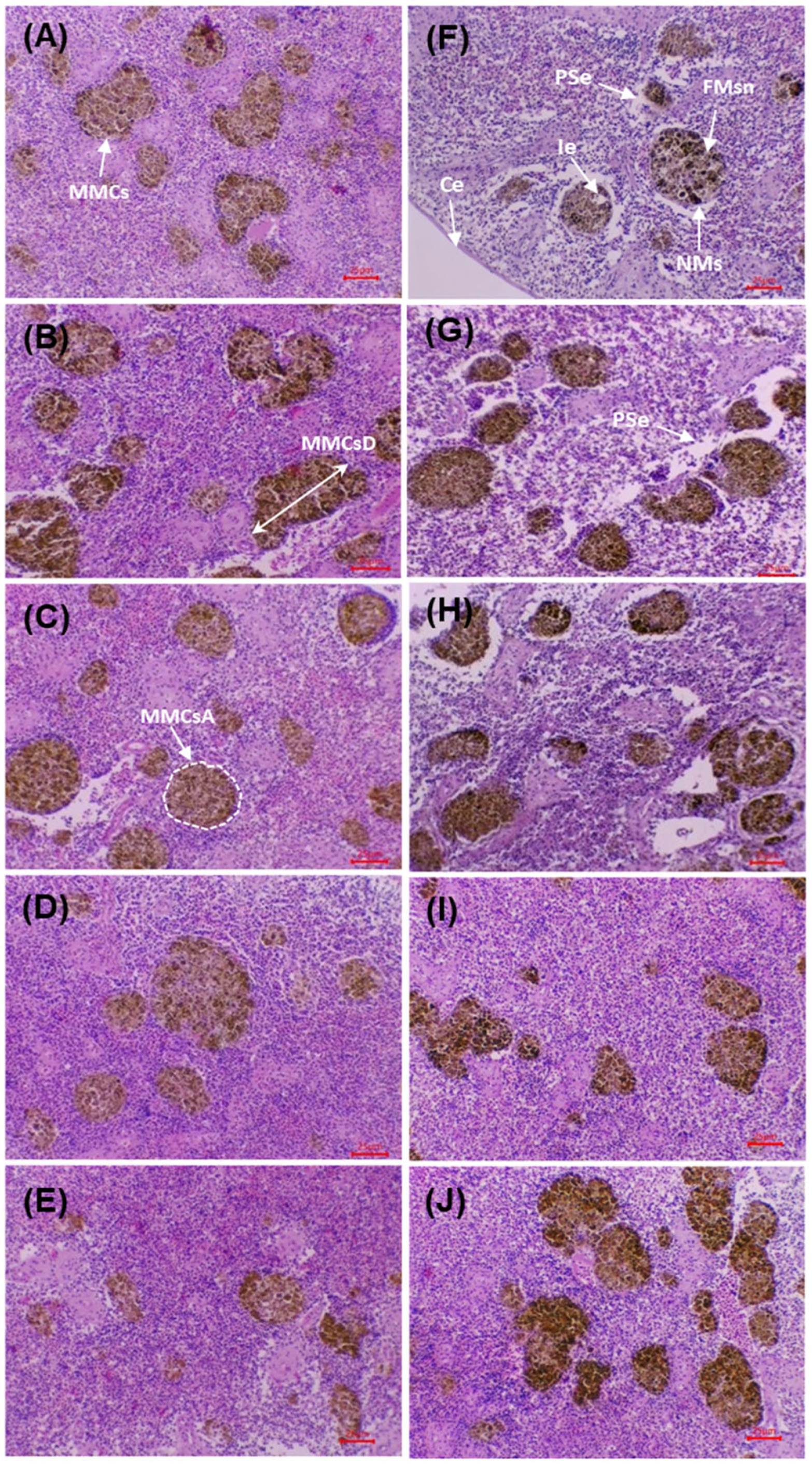 V. cholerae. Before the challenge, the control (0 g/kg) displayed preserved architecture with an intact capsule, no necrosis or oedema, and MMCs of low size and density. In the supplemented groups (5–20 g/kg), a progressive increase in MMCs density/size was observed, together with improved organisation of sinusoids and trabeculae, without evident degenerative lesions.