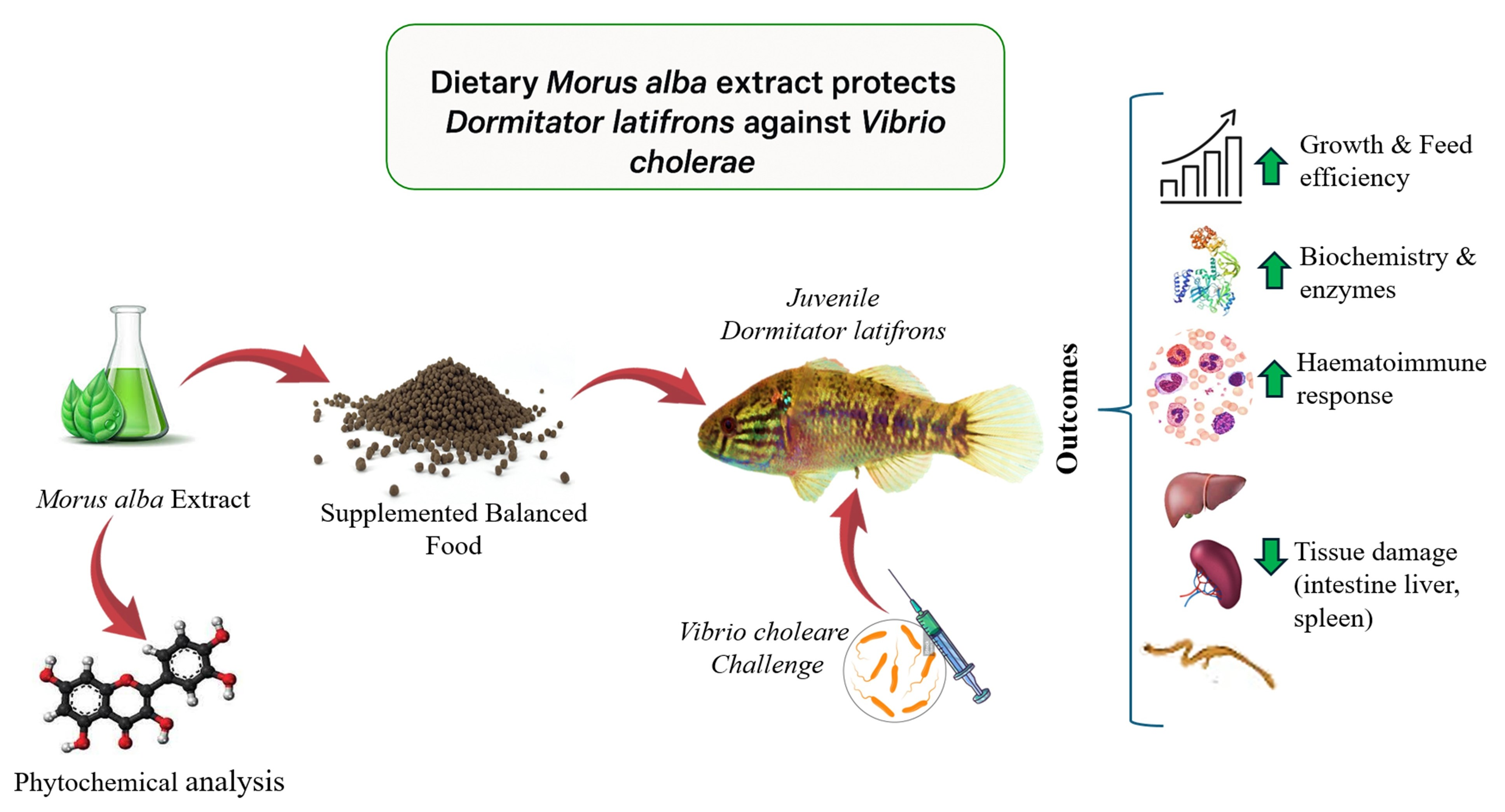 Given the multifunctional potential of MA and the urgent need for prophylactic alternatives against infections such as those caused by V. cholerae, the present study posits the hypothesis that dietary supplementation with MA extract will improve performance, modulate biochemical and enzymatic profiles, reinforce haemato-immunology and preserve tissue integrity, thereby increasing resistance to infection in D. latifrons.