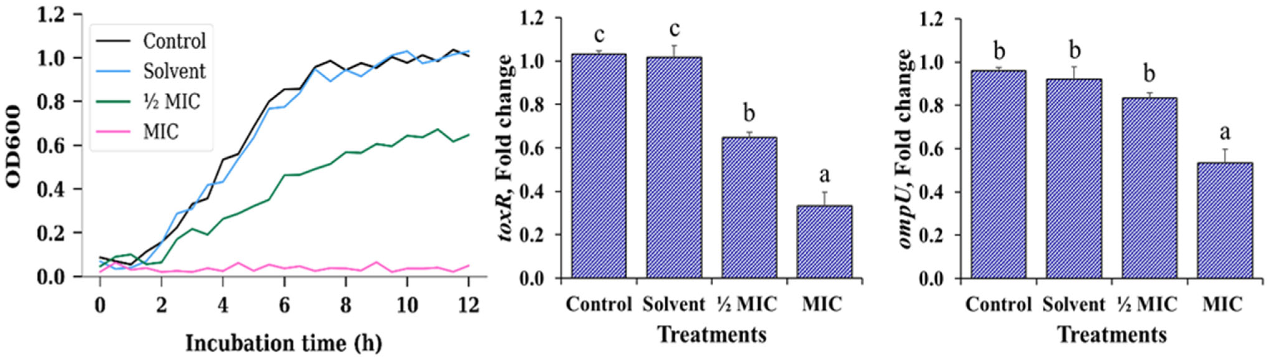 For ompU, the control, solvent and ½ MIC treatments maintained relative expression values close to 1, with no significant differences among them, indicating that moderate exposure to the extract does not appreciably alter the transcription of this outer membrane porin. Only the MIC induced a significant reduction in ompU expression (p < 0.05), an effect that became evident solely under fully inhibitory conditions. Taken together, these findings indicate that the MA extract not only limits the proliferation of V. cholerae in a concentration-dependent manner, but also modulates its virulence potential. toxR appears to respond earlier, even at sub-inhibitory concentrations, whereas significant repression of ompU is only detected when bacterial growth is completely inhibited, suggesting a hierarchical or sequential sensitivity of these virulence-associated targets to the extract.