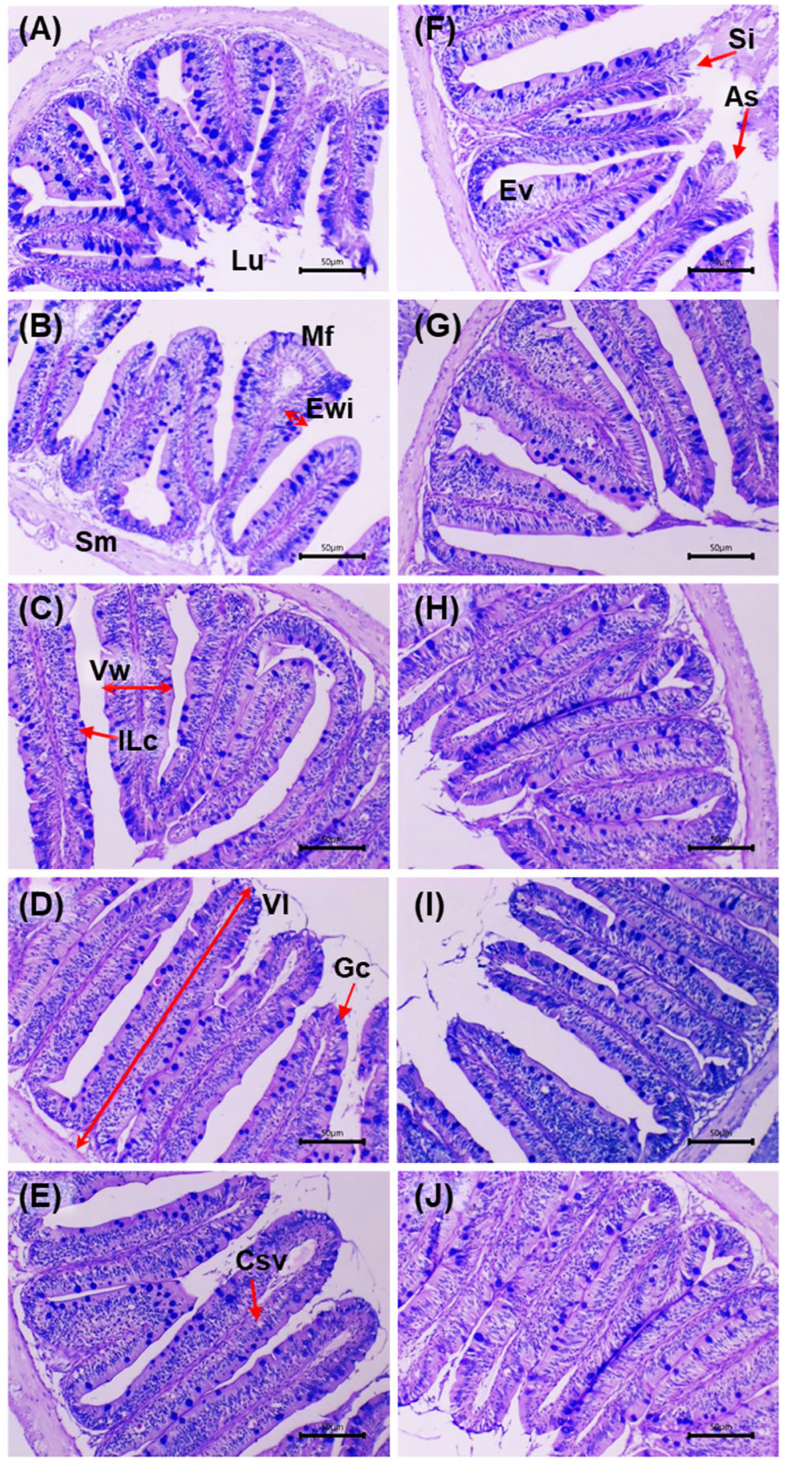 V. cholerae. Before the challenge, the control (0 g/kg) displayed an intact mucosa: simple columnar epithelium with well-defined basal nuclei, villi with preserved architecture and regularly distributed goblet cells; the lamina propria and submucosa without inflammatory infiltrate, and compact muscular layers. In the supplemented groups (5–20 g/kg), a trophic mucosal response was observed, with greater villus height/thickness, enterocytes with dense cytoplasm and orderly nuclei, and an increased number of goblet cells with marked AB–PAS positivity.