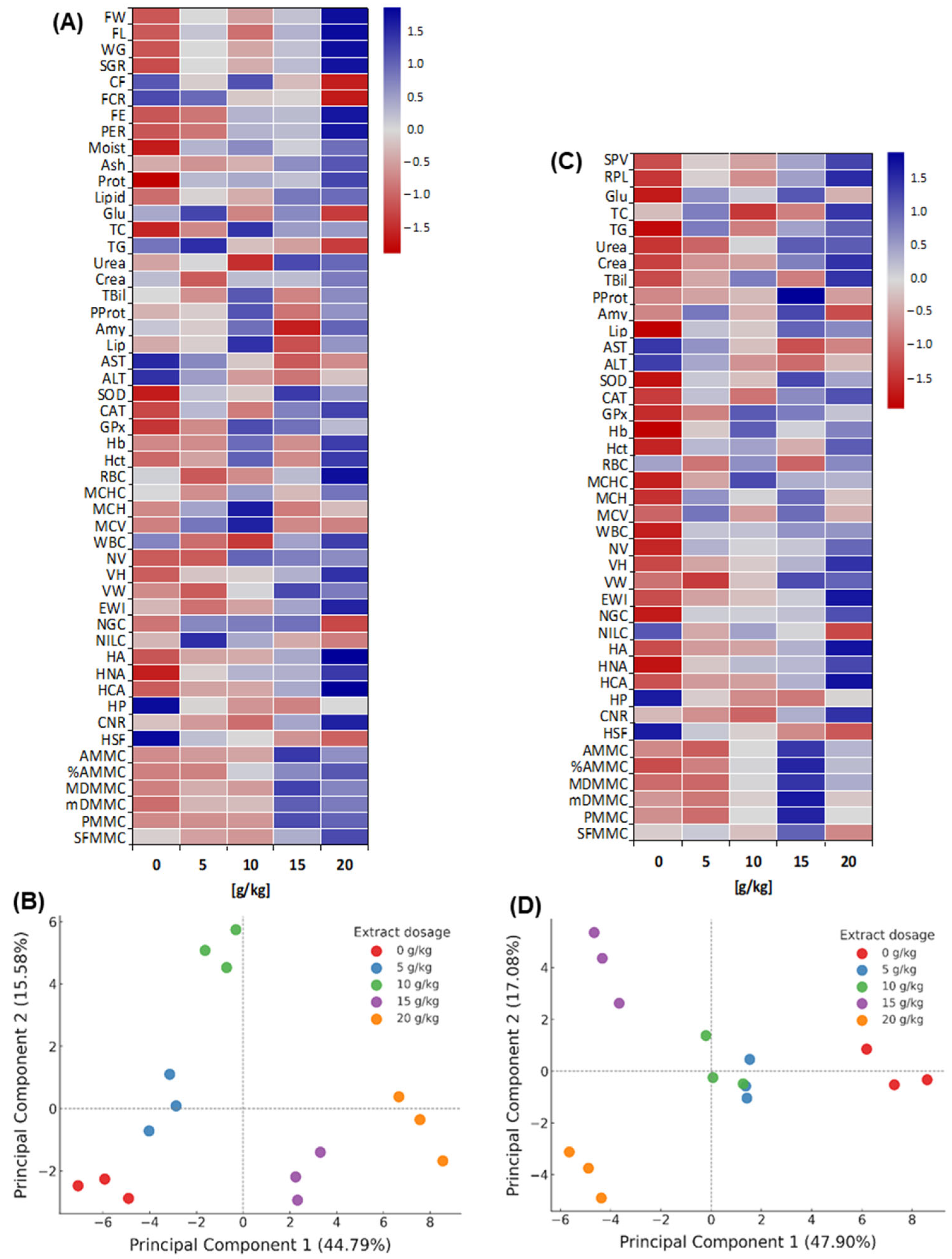 Figure 7D) explained 47.90% (PC1) and 17.08% (PC2) of the variance (64.98% total). The control occupied the positive extreme of PC1, associated with damage/stress markers such as ALT/AST, bilirubin, urea and creatinine, whereas 5–10 g/kg lay centrally. By contrast, negative loadings grouped survival, plasma proteins, antioxidant, haematological and morphohistological traits. The model discriminated the treatments, with 15 g/kg positioned in the upper left (maximal separation from the control) and 20 g/kg in the lower left (close to 15 g/kg, differing on PC2).