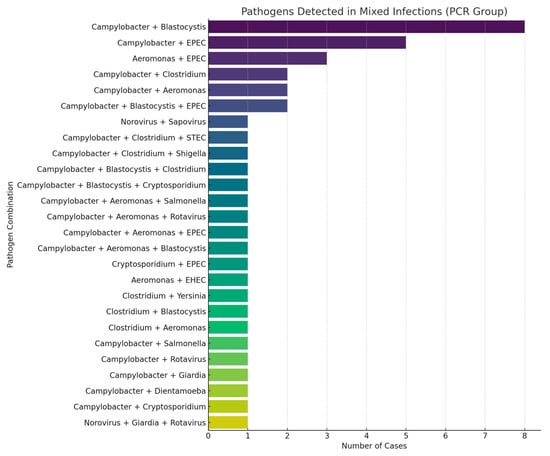 The time to diagnostic result was significantly shorter in the PCR group, with a median turnaround time of 1 day compared to 2 days in the traditional testing group (p < 0.0001). Although culture positivity was higher in the traditional group (23.1% vs. 0.8%; p < 0.0001), the overall diagnostic yield was significantly greater in the PCR group (77.68% vs. 41.09%; p < 0.001) (Table 3). Multiplex PCR enabled the detection of a broader spectrum of pathogens, including bacteria, viruses, and protozoa, providing a more comprehensive diagnostic profile (Figure 2). Campylobacter was exclusively identified by PCR, with a prevalence of 46.28% among patients tested with this method. Additionally, mixed infections were detected in 34.7% of PCR-tested patients, including 25.6% with dual and 9.1% with triple infections. In contrast, no mixed infections were reported using traditional diagnostic methods. The most frequently observed dual-pathogen combination was Campylobacter with Blastocystis hominis (n = 8), while the most common triple-pathogen combination included Campylobacter, Blastocystis hominis, and enteropathogenic E. coli (EPEC) (n = 2) (Figure 3). C. difficile was detected at similar frequencies in both groups (15.7% in the PCR group vs. 15.06% in the traditional group; p = 0.53), indicating the reliability of both diagnostic approaches for this pathogen.