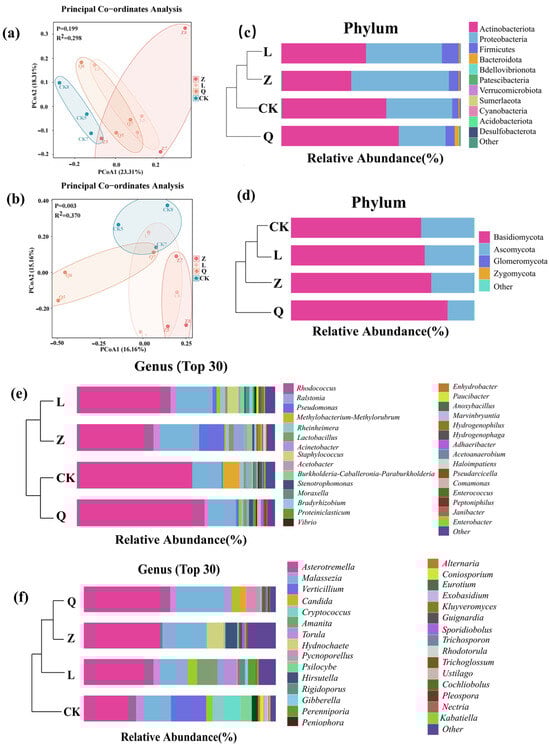 In the principal coordinate analysis (PCoA), both fungal and bacterial endophytic microbiota of the antibiotic-treated groups of calli were clearly separate from the control group, demonstrating the effective alteration of endophytic microbiota in the callus tissue by antibiotics. The fungal communities exhibited statistically significant treatment-driven reshaping (p = 0.003; R2 = 0.370), indicating selective antibiotic pressures across groups. In contrast, the bacterial communities showed non-overlapping 95% confidence ellipses between the control group (CK-callus) and antibiotic-treated groups (Z/L/Q-callus) (p = 0.199; R2 = 0.298). Notably, higher intra-group heterogeneity within replicates of Z-treated callus samples was observed (Figure 1a,b).