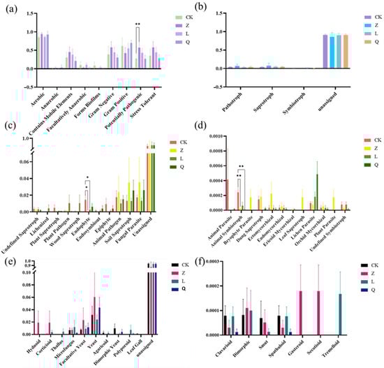 Functional prediction of endophytes in differently treated grapevine calli. (a) Phenotype prediction (Bugbase) of bacterial endophytes in differently treated grapevine calli. Functional prediction of the fungal endophytes in differently treated grapevine calli was performed using (b) the abundance of fungal trophic mode, (c,d) guild, and (e,f) growth form, as predicted by the FUNGuild program. “*” indicates a significant difference (** p < 0.01; * p < 0.05).