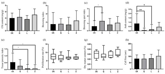 Morphophysiological impacts of antibiotic treatment on grapevine calli. (a) Chlorophyll (Chl) content, (b) browning index, (c) browning spot index, (d) anthocyanin (Anth) content, (e) tissue porosity, (f) proliferation rate, (g) dry matter content, and (h) cell diameter (** p < 0.01; * p < 0.05).