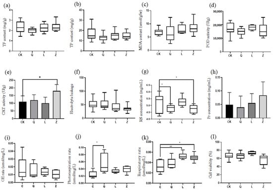 Physiological and biochemical responses in antibiotic-treated grapevine calli. (a) total flavonoid (TF) content, (b) total phenol (TP) content, (c) malondialdehyde (MDA) content, (d) peroxidase (POD) activity, (e) catalase (CAT) activity, (f) electrolyte leakage, (g) reducing sugar (RS) concentration, (h) protein (Pr) concentration, (i) oxygen evolution (OE) rate, (j) photorespiration rate, (k) respiratory rate, and (l) cell viability (** p < 0.01; * p < 0.05).