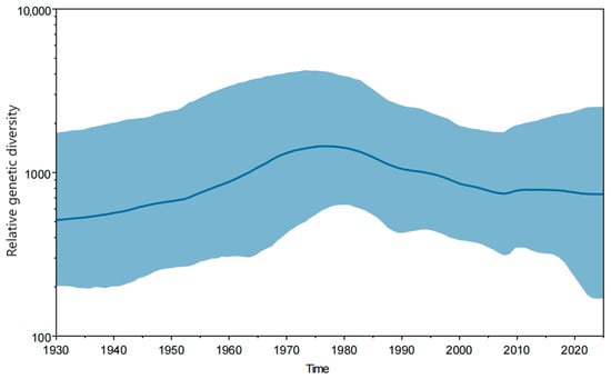 Moreover, the analysis of nucleotide substitution saturation utilizing Xia’s test yielded results indicating ISS < ISS.C with a non-significant difference, implying that nucleotide substitutions had not reached saturation. Collectively, these findings confirmed the suitability of the assembled JEV dataset for phylogenetic reconstruction. Model selection conducted via ModelFinder in PhyloSuite v1.2.2 identified GTR + G4 as the best-fitting nucleotide substitution model [23,24]. A Bayesian Markov Chain Monte Carlo (MCMC) analysis was subsequently performed using BEAST v1.10.4 [25] to construct a maximum clade credibility (MCC) tree [26]. Three independent MCMC runs were conducted, each with a chain length of 5 × 108 generations, for reproducibility and convergence validation and to ensure adequate mixing. Based on Bayes factor (BF) comparisons and 95% highest posterior density (HPD) intervals, a Bayesian skyline model with an uncorrelated lognormal relaxed molecular clock was determined to be the best-fitting model [27], and the optimal model was further validated using Bayes factor tests. Parameter convergence and evolutionary rate estimation were evaluated utilizing Tracer software v1.10.4, with a criterion that the Effective Sample Size (ESS) values must meet or exceed 200 to be considered acceptable. The MCC tree was annotated with TreeAnnotator v1.10.4 after discarding the initial 10% of samples as burn-in. Population dynamic history was inferred through Bayesian skyline reconstruction, and the Bayesian MCMC approach was applied to estimate each parameter with 95% HPD intervals representing uncertainty. Posterior probability values were used to evaluate node support across the phylogenetic tree.