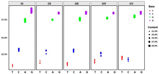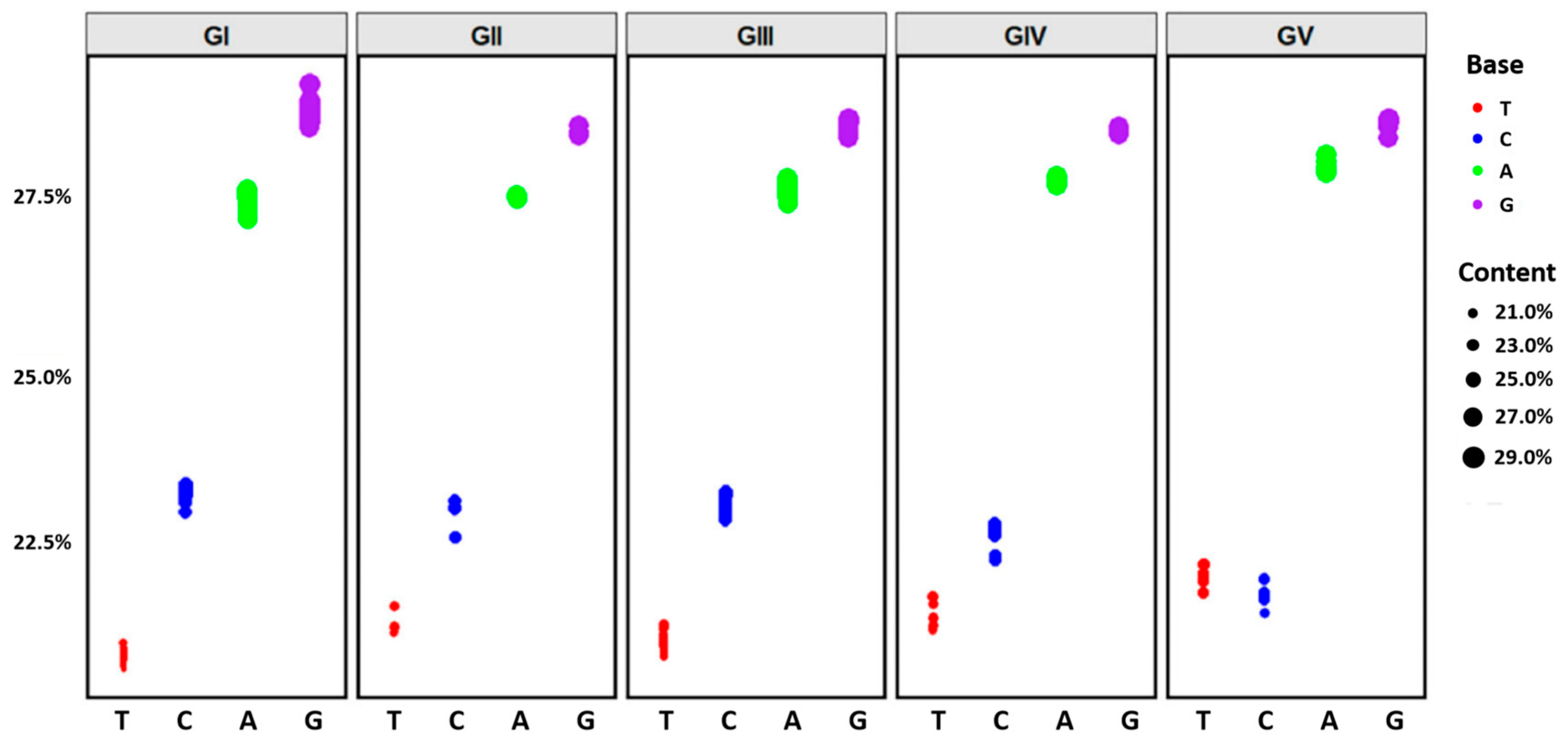 Nucleotide composition analysis of JEV revealed similar base composition patterns across the five genotypes (Figure 5). For GI-GIV, the base content followed the order: G > A > C > T. Notably, GV exhibited a distinct pattern with G > A > T > C, where T content exceeded C content. Among the five genotypes, T content ranged from 20.8% to 21.9%, with the lowest value observed in GI (20.8%) and the highest in GV (21.9%). C content ranged from 21.8% to 23.2%, with the lowest value in GV (21.8%) and the highest in GI (23.2%). A content ranged from 27.3% to 27.9%, with the lowest value in GI (27.3%) and the highest in GV (27.9%). G content ranged from 28.4% to 28.7%, with the highest value in GI (28.7%), while GII and GIV both exhibited the lowest value (28.4%). Detailed nucleotide compositions for each genotype are provided in Table 2.