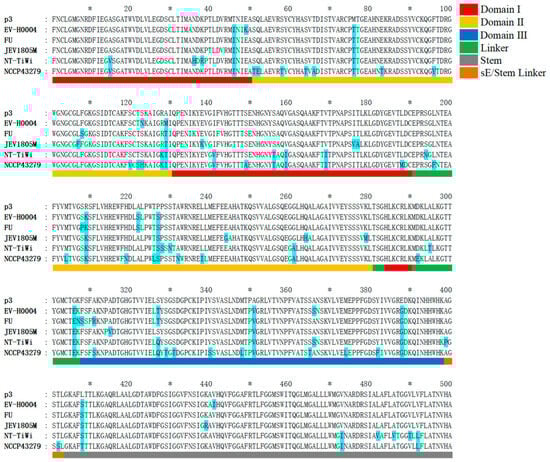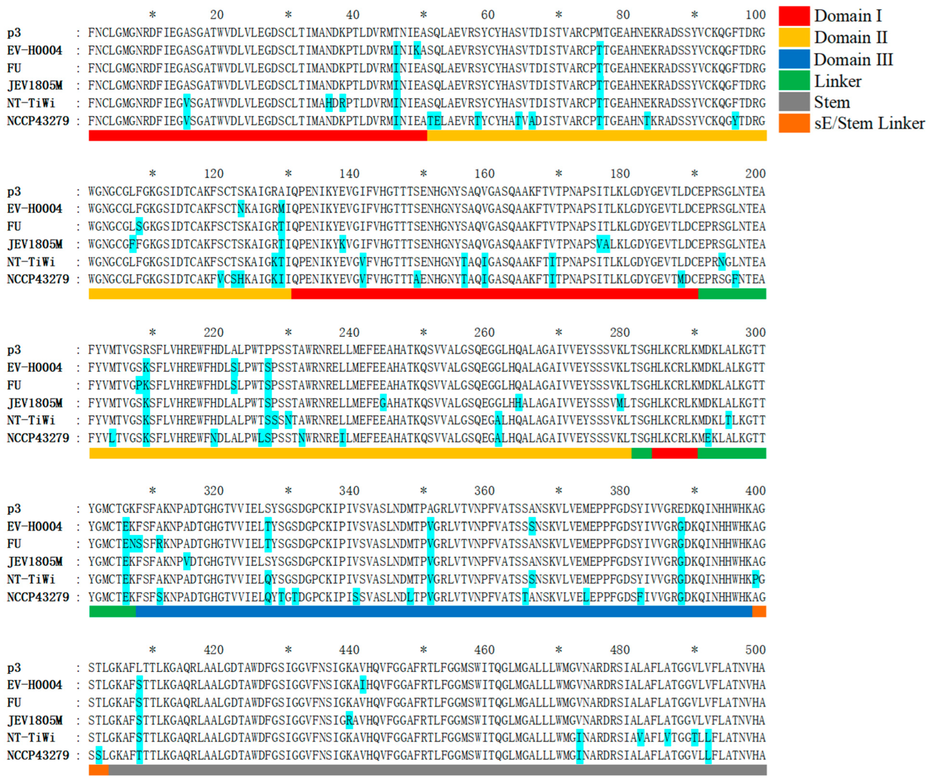 Analysis of amino acid mutation sites in the E protein of latest human JEV strains compared to the vaccine P3 strain. TWN/2022-EV-H0004/2022 (EV-H0004) represents a GI strain; FU represents a GII strain; JEV1805M represents a GIII; JEV/Human/NT_Tiwi Islands/2021 (NT-TiWi) represents a GIV strain; NCCP 43279 represents a GV strain. Amino acids differing from the P3 strain are highlighted in sky blue background. In the scale bar, major ticks are placed every 20 units, with asterisks (*) denoting the intervening minor tick positions. The structural information of the corresponding protein is indicated by the colors below the sequence: red for Domain I, yellow for Domain II, dark blue for Domain III, green for the Linker, gray for the Stem, and orange for the sE/Stem Linker.