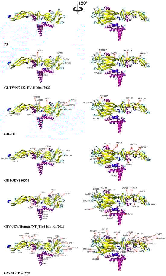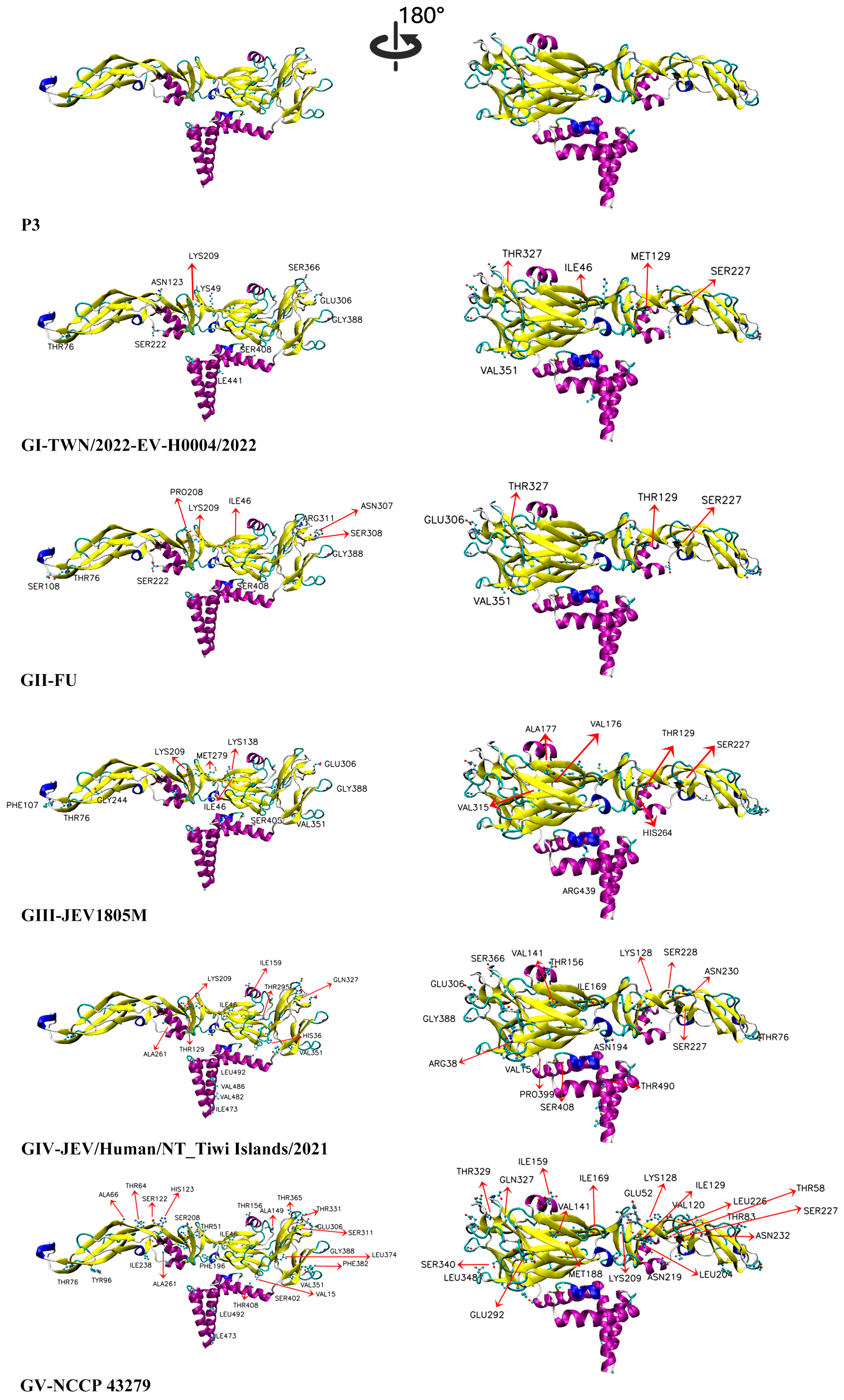 Compared to the P3 strain, the GI strain (TWN/2022-EV-H0004/2022) exhibited 11 mutations with significant physicochemical alterations: eight sites (T46I, M76T, A222S, P227S, G306E, A366S, E388G, L408S) led to notable changes in hydrophobicity/hydrophilicity; amino acid side chains exerted varied steric effects at A129M, G306E, A351V, and E388G; and significant charge changes were observed at E49K, G306E, and E388G. The GII strain (FU) showed 14 mutations with significant physicochemical changes: eleven sites (T46I, M76T, F108S, A129T, A222S, P227S, G306E, F308S, A311R, E388G, L408S) resulted in notable hydrophobicity/hydrophilicity alterations; side chains exhibited differential steric effects at F108S, G306E, F308S, A311R, A351V, and E388G; and significant charge changes occurred at G306E, K307N, A311R, and E388G. The GIII (JEV1805M) displayed 15 mutations with significant physicochemical alterations: ten sites (T46I, M76T, A129T, T177A, P227S, E244G, K279M, G306E, E388G, L408S) led to notable hydrophobicity/hydrophilicity changes; side chains showed varied steric effects at E244G, G306E, A315V, A351V, and E388G; and significant charge changes were observed at E138K, E244G, Q264H, K279M, G306E, and E388G. The GIV strain (JEV/Human/NT_Tiwi Islands/2021) exhibited 18 mutations with significant physicochemical changes: twelve sites (T46I, M76T, A129T, P227S, P228S, G261A, A295T, G306E, A366S, E388G, L408S, V490T) resulted in notable hydrophobicity/hydrophilicity alterations; side chains exerted differential steric effects at A15V, G261A, G306E, S327Q, A351V, E388G, A399P, and A486V; and significant charge changes occurred at N36H, G306E, and E388G. The GV strain (NCCP 43279) showed 22 mutations with significant physicochemical alterations: fifteen sites (T46I, T66A, M76T, E83T, S120V, A129I, S149A, P227S, A232N, G261A, G306E, A311S, V340S, E388G, L408T) led to notable hydrophobicity/hydrophilicity changes; side chains exhibited varied steric effects at A15V, G261A, G306E, S327Q, A351V, E388G, and L408T; and significant charge changes were observed at Q52E, E83T, S123H, H219N, G306E, and E388G. Detailed information on all differential amino acid sites is provided in Supplementary Table S2.