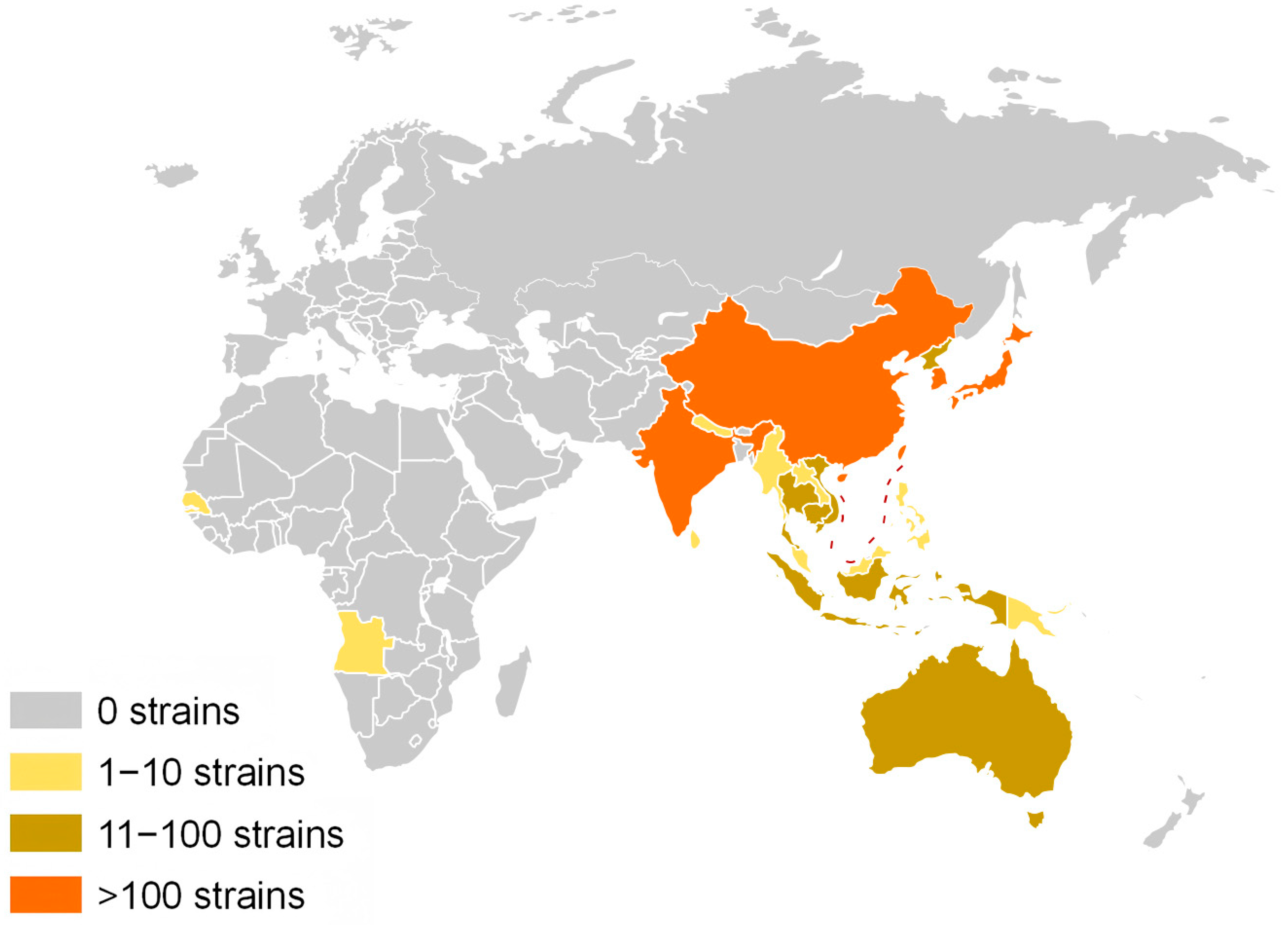The global distribution of JEV endemic regions is depicted with varying background colors to indicate the prevalence of JEV strains. Regions with no reported distribution of JEV strains are highlighted with a gray background. Areas with a distribution of 1–10 JEV strains are represented with a yellow background, whereas regions with 11–100 strains are marked with a brown background. Finally, areas exhibiting a distribution of over 100 JEV strains are denoted with an orange background. The red dashed line represents the South China Sea maritime boundary.