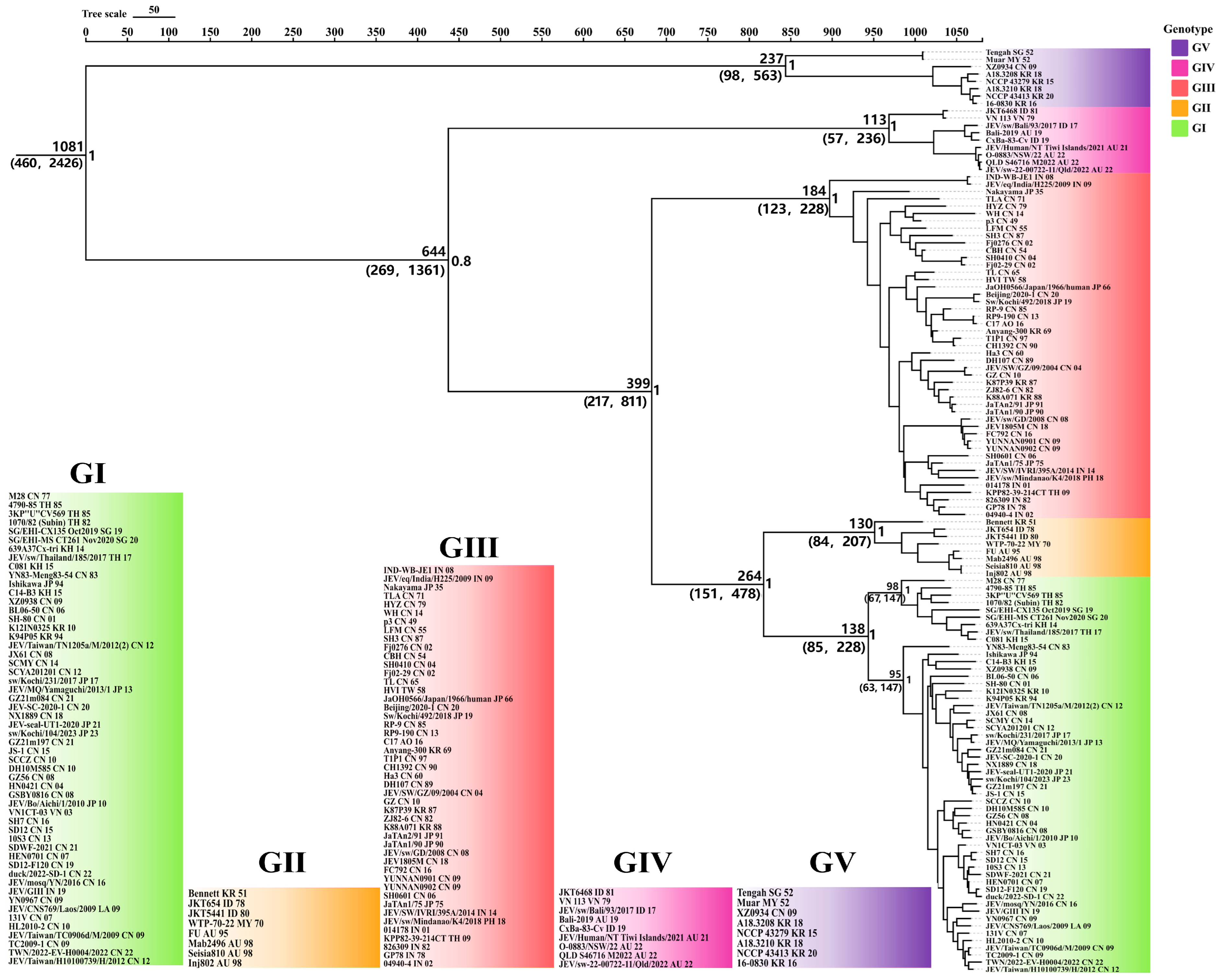 To systematically elucidate the evolutionary timescales and population dynamics of JEV genotypes, we assembled a comprehensive global dataset comprising 126 complete genomic sequences, ranging from 1935 to the present. This dataset encompasses all known genotypes, including newly sequenced GII strains. Utilizing this extensive dataset, we conducted a thorough evolutionary analysis to reconstruct the divergence timeline and demographic history of each genotype. Our findings suggest that the sequential emergence of the five JEV genotypes occurred in the order of GV, GIII, GI, GII, and GIV. This proposed timeline challenges previous studies and provides a novel evolutionary framework, thereby offering a scientific basis for understanding viral evolution and anticipating future transmission risks. The detailed findings are presented below.
