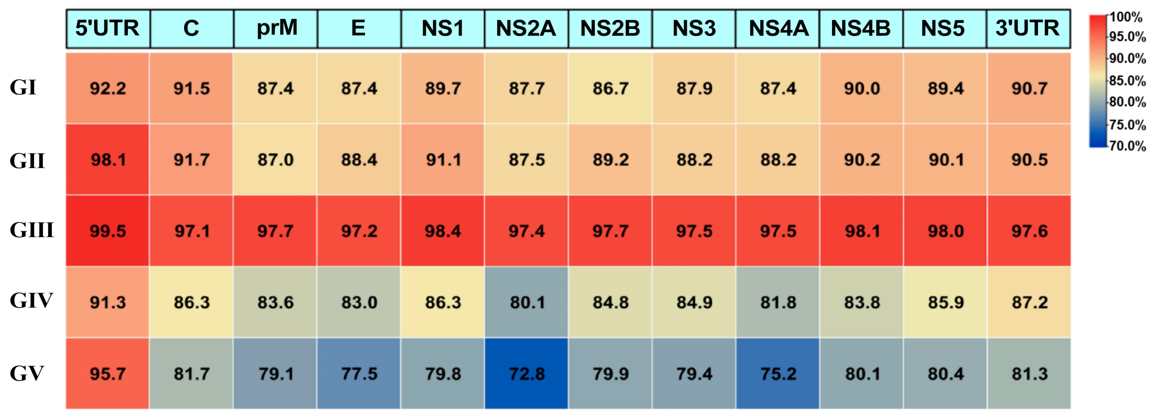 Based on comparative genomic analysis with the P3 vaccine strain, significant differences in sequence similarity were observed among different JEV genotypes (Figure 4). The GIII exhibited extremely high similarity with the P3 strain across all structural regions (97.1–99.5%), whereas other genotypes showed relatively lower similarity, particularly GIV and GV, which displayed the most pronounced divergence. Comparative analysis of key functional regions revealed that sequence similarity between each genotype and the P3 vaccine strain differed most notably in the E, NS2A, and NS4A proteins. As the major antigenic target, the E protein exhibited similarity in the order GIII (97.2%) > GII (88.4%) > GI (87.4%) > GIV (83.0%) > GV (77.5%). The NS2A protein, which plays a critical role in viral assembly and immune evasion, showed similarity in the order GIII (97.4%) > GI (87.7%) > GII (87.5%) > GIV (80.1%) > GV (72.8%). The NS4A protein, involved in the formation of the viral replication complex, exhibited similarity in the order GIII (97.5%) > GII (88.2%) > GI (87.4%) > GIV (81.8%) > GV (75.2%). All three key proteins displayed a gradient pattern of similarity, with GIII showing the highest and GV the lowest, among which NS2A exhibited the greatest degree of variation, with a 24.6 percentage point difference between GIII and GV.