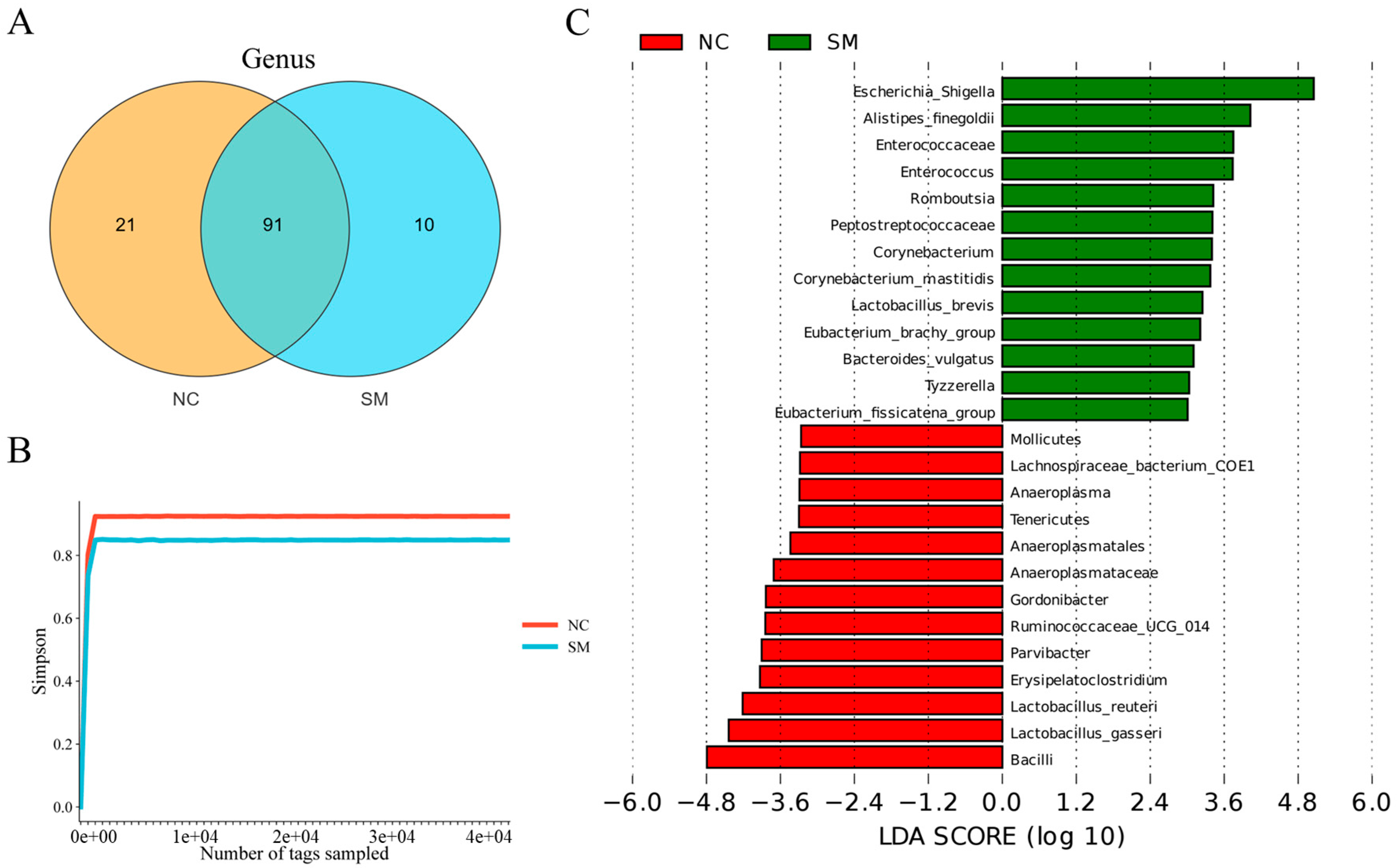 3.1. SM Exposure Alters Gut Microbiota Composition and Diversity