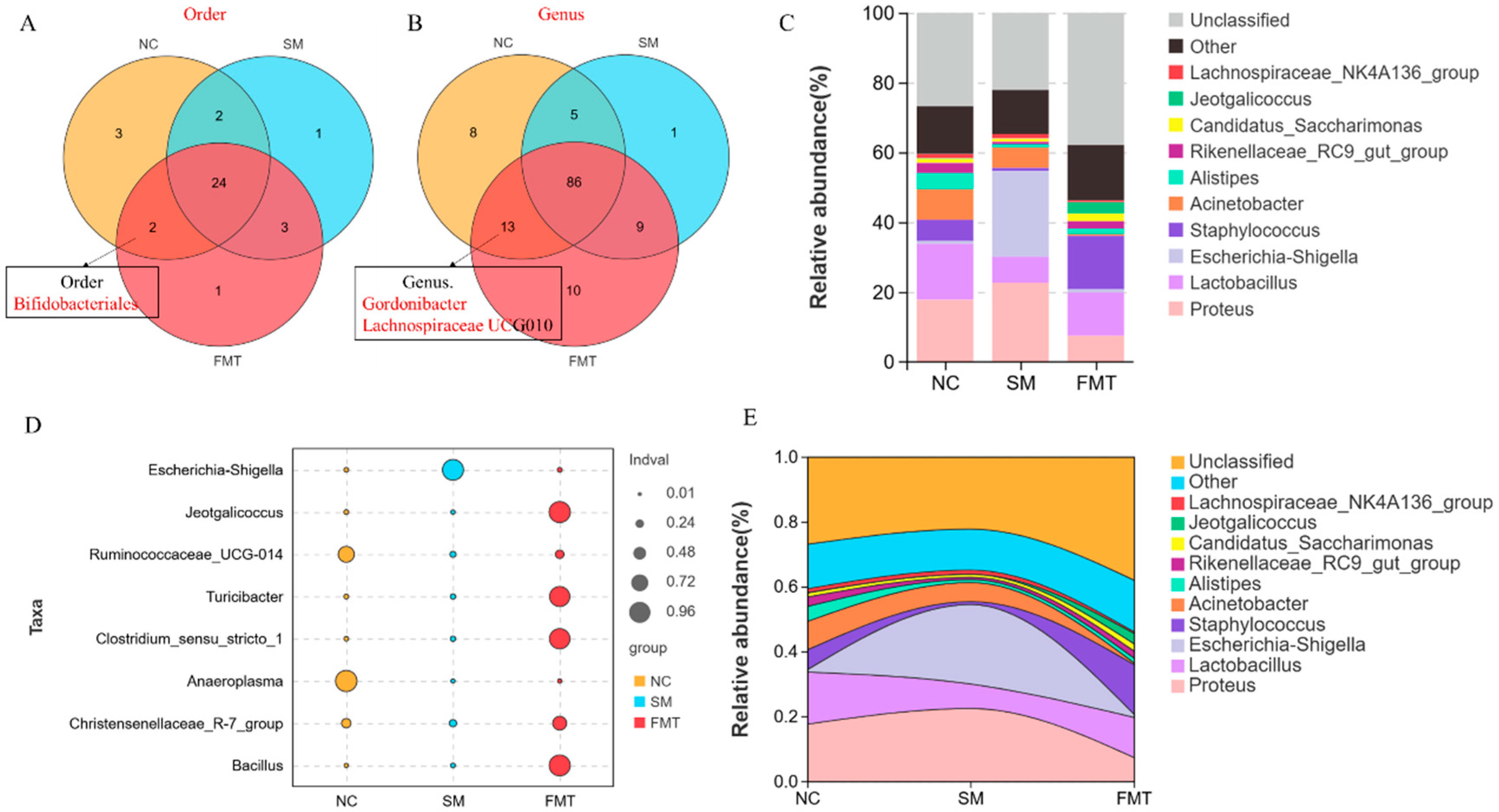 3.4. FMT Ameliorates SM-Induced Intestinal Injury and Restores Microbial Homeostasis
