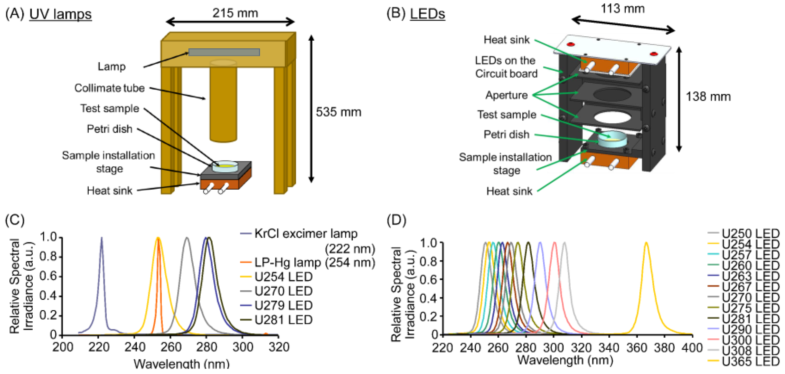 - Ishida, K.; Onoda, Y.; Kadomura-Ishikawa, Y.; Nagahashi, M.; Yamashita, M.; Fukushima, S.; Aizawa, T.; Yamauchi, S.; Fujikawa, Y.; Tanaka, T.; et al. Development of a Standard Evaluation Method for Microbial UV Sensitivity Using Light-Emitting Diodes. Heliyon 2024, 10, e27456. [Google Scholar] [CrossRef]