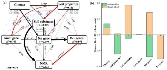 Effect of environmental viabilities on the N mineralization rate (NMR). (a,b) Directed graph of the partial least squares path model (PLS-PM) showing the effects of the climate, soil properties, soil substrates, and microbial N-cycling pathways (e.g., ammonification (amm), nitrification (nir), and denitrification (den)). Single-headed arrows indicate the hypothesized direction of causation. Indicated values are the path coefficients (*** when p < 0.001, ** when p < 0.05, and * when p < 0.01). Green arrows indicate a positive effect, whereas red arrows indicate a negative effect. Black and red arrows indicate positive and negative relationships, respectively. The arrow width is proportional to the strength of the relationship. Models with different structures were assessed using the goodness of fit statistic, a measure of the overall prediction performance. An a priori model associated with this figure is available in Figure S1.