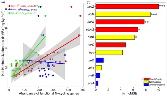 Contribution of different microbial N-cycling functional genes to N mineralization rate (NMR). (a) Regression analysis shows the different microbial N-cycling pathways (e.g., ammonification, nitrification, and denitrification) to NMR; (b) random forest analysis shows the significant microbial N-cycling functional genes for N mineralization rate (*** when p < 0.001, ** when p < 0.05, and * when p < 0.01).